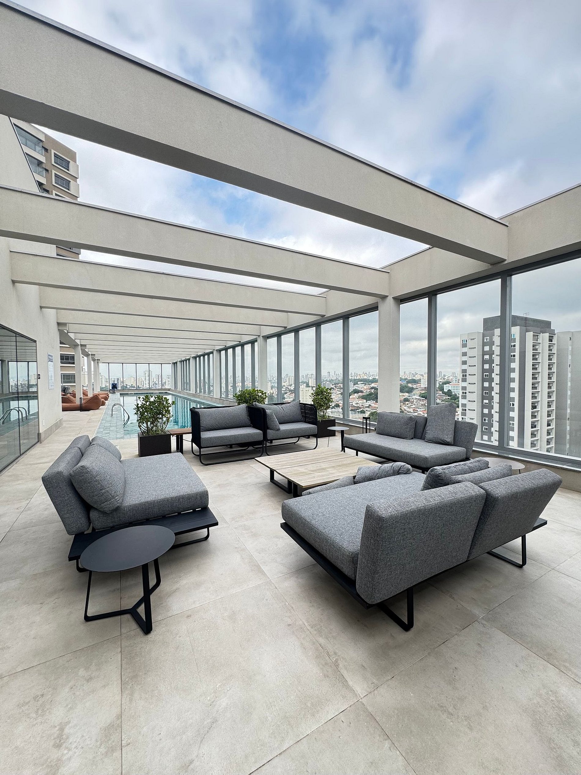 • Piscina no terraço com espreguiçadeiras , sofás e espaço de convivência