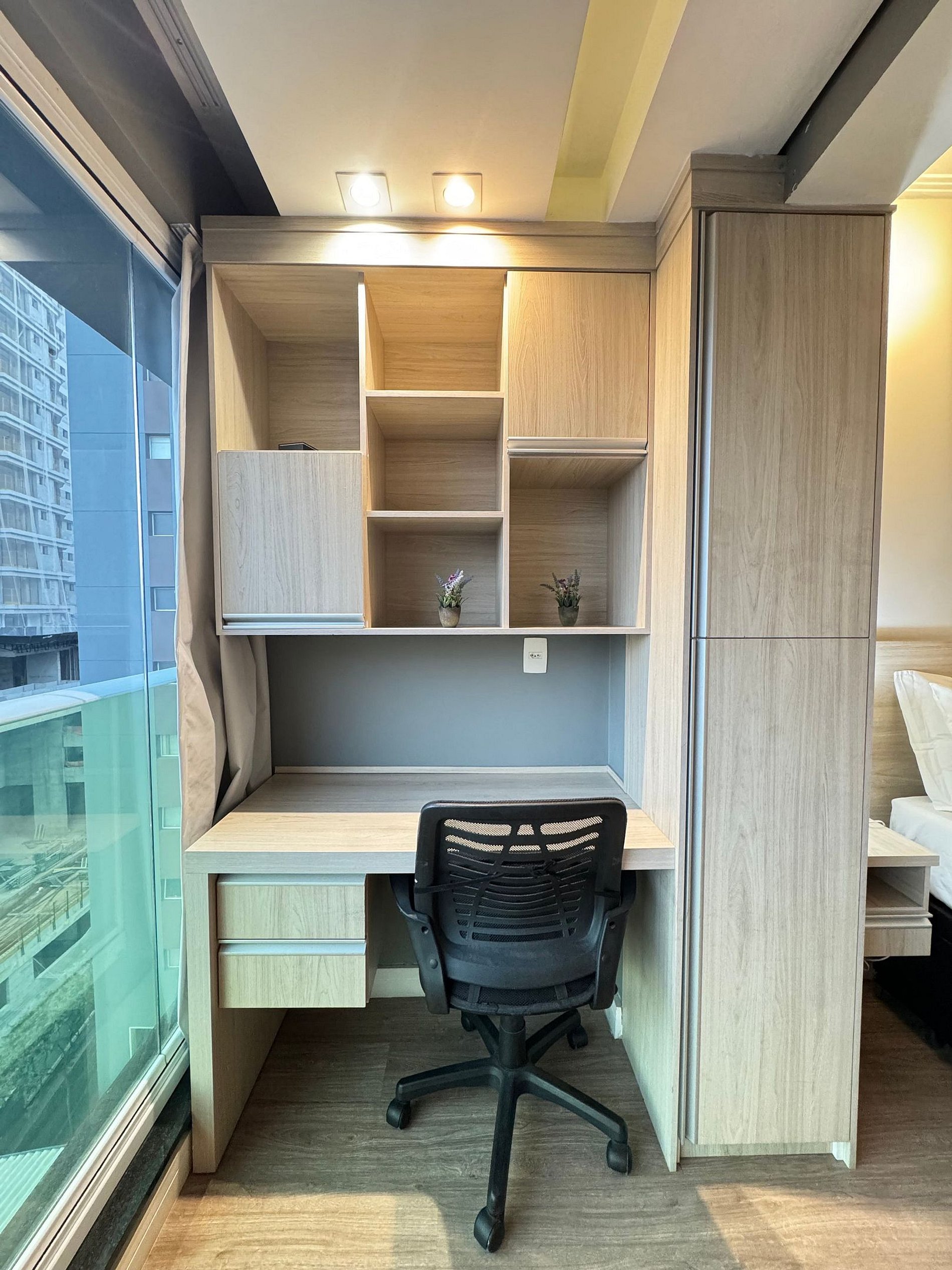 Nosso Studio de 24 m² é perfeitamente dimensionado para acomodar até duas pessoas com o máximo conforto. O dormitório, equipado com uma cama de casal de alta qualidade e uma Smart TV, é um convite ao descanso após um dia explorando a cidade.