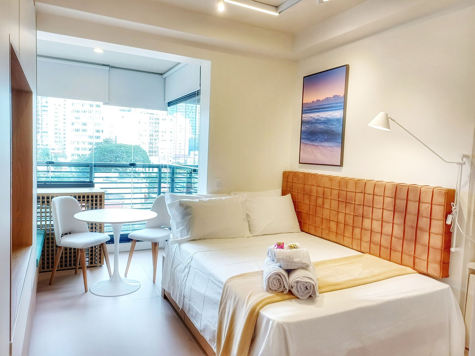 Belíssimo Studio localizado na zona sul da capital paulistana , no Broklin, bairro de alto padrão extremamente bem servido de bares, restaurantes e empresas. Este Belo apartamento esta em um empreendimento novo, seguro e moderno e conta com academia e lavanderia. O apartamento é completíssimo com decoração fina e elegante em tons de madeira, repleto em armários, excelente para longas estadias. A localização é privilegiada e estratégica próxima a Vila Olímpia e Moema.