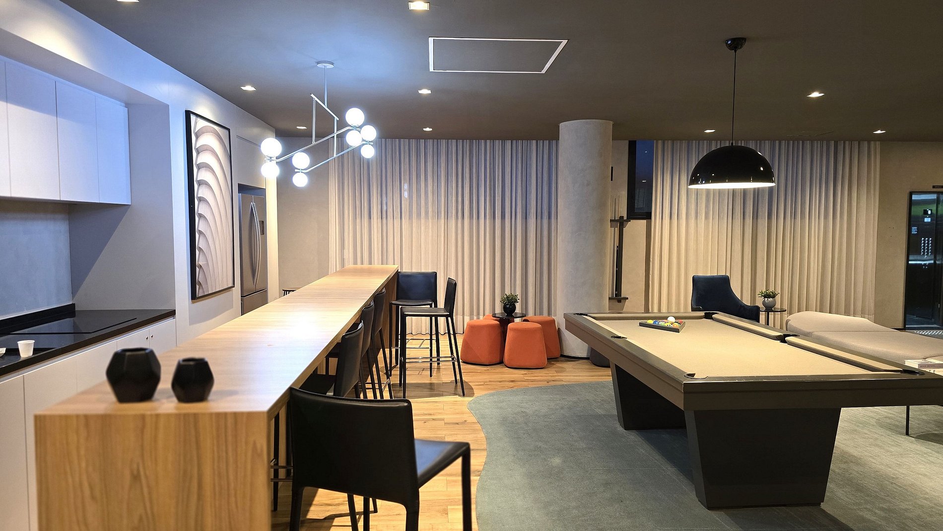 • Mesa de sinuca , cozinha compartilhada para refeições e minimercado