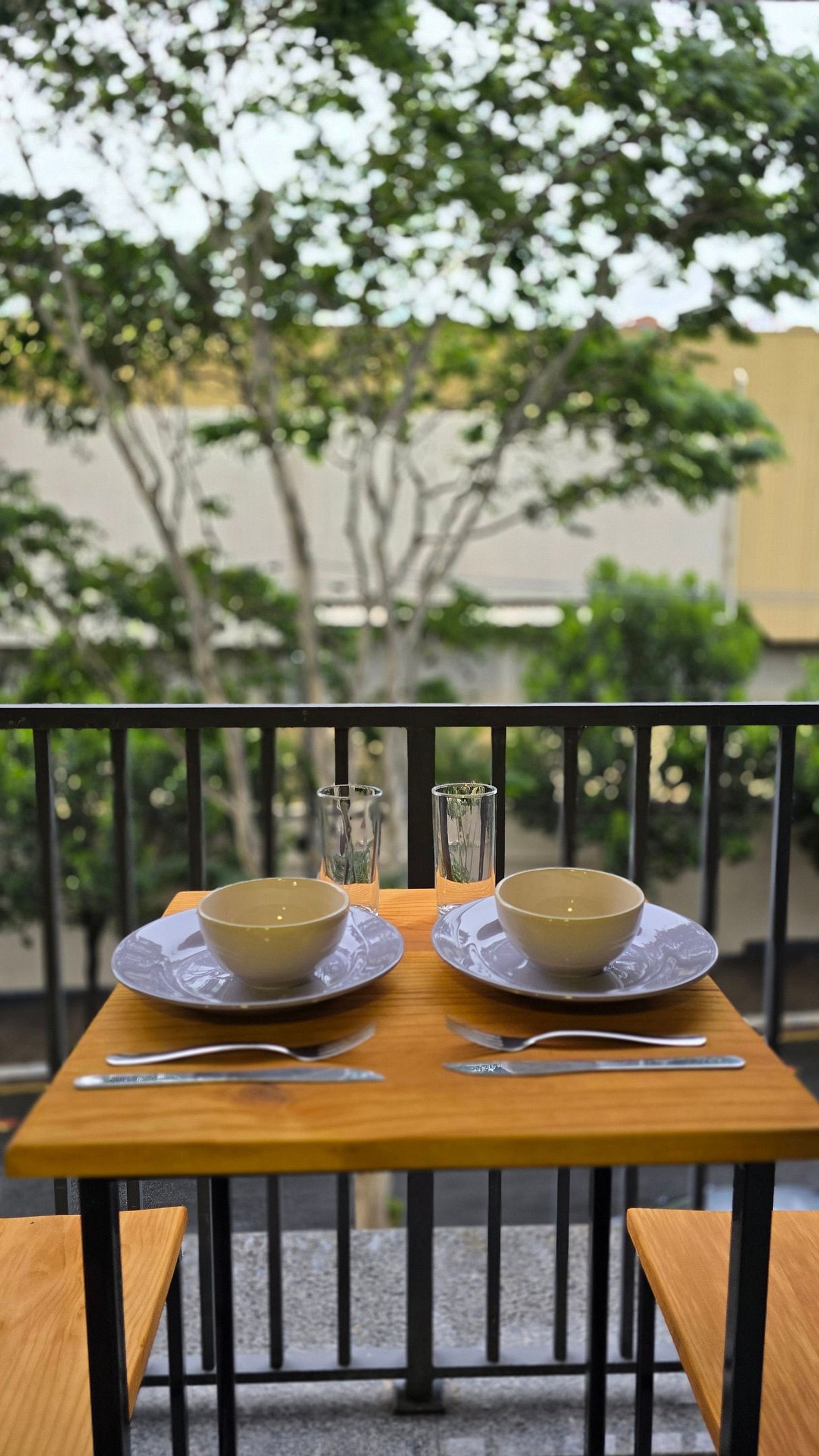 • Sacada aberta com mesa para duas pessoas.