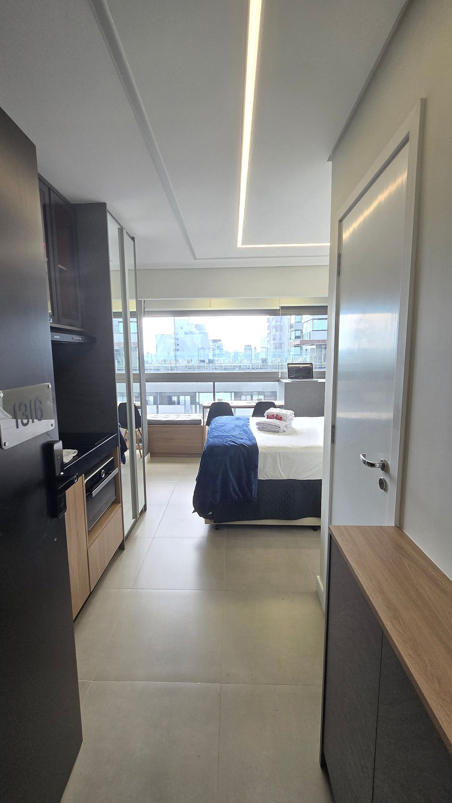 Studio bem iluminado e confortável, em tons neutros alternando cor cinza e madeira. Possui uma grande janela que mantém o ambiente claro e arejado além da vista privilegiada da metrópole.