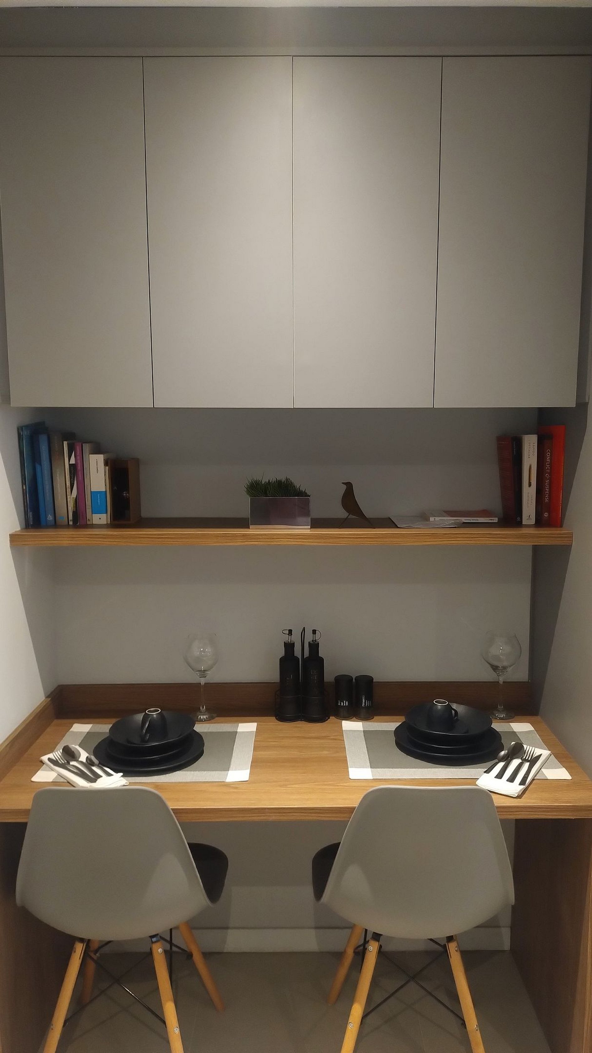 • Mesa para duas pessoas e espaço para trabalho remoto.