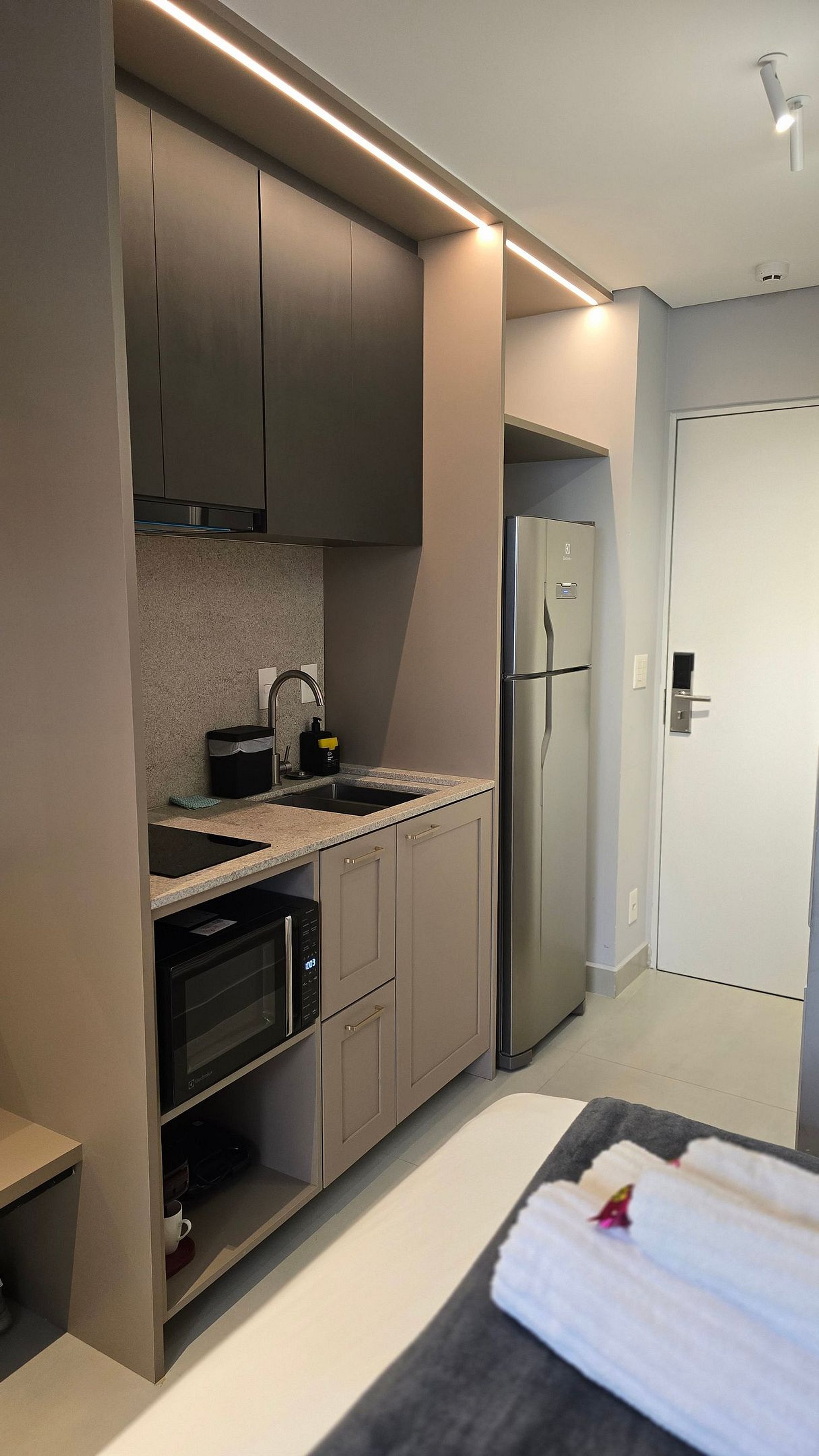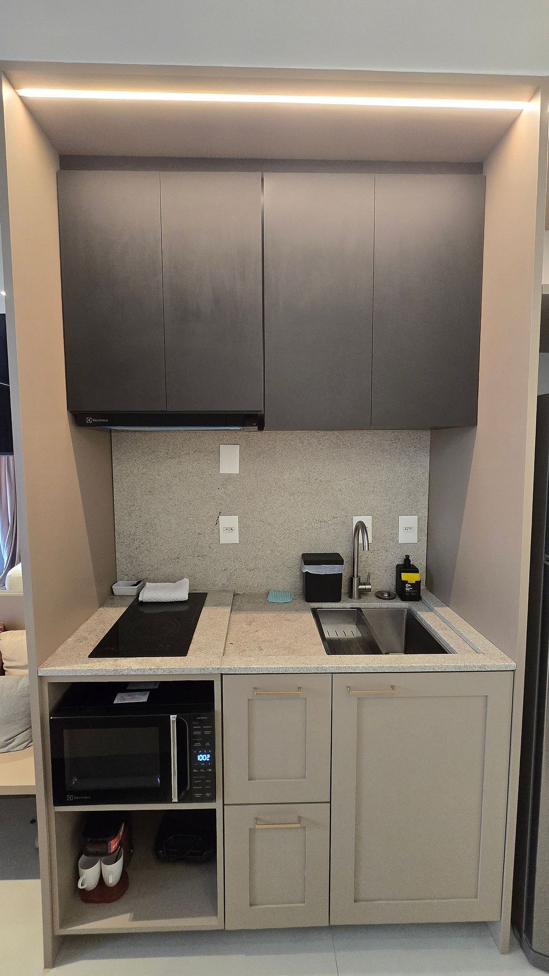 • Cozinha completa equipada com Geladeira grande adequada para longas estadias , fogão cooktop de duas bocas, micro-ondas, liquidificador , Cafeteira, chaleira elétrica, sanduicheira, panelas e utensílios de qualidade.