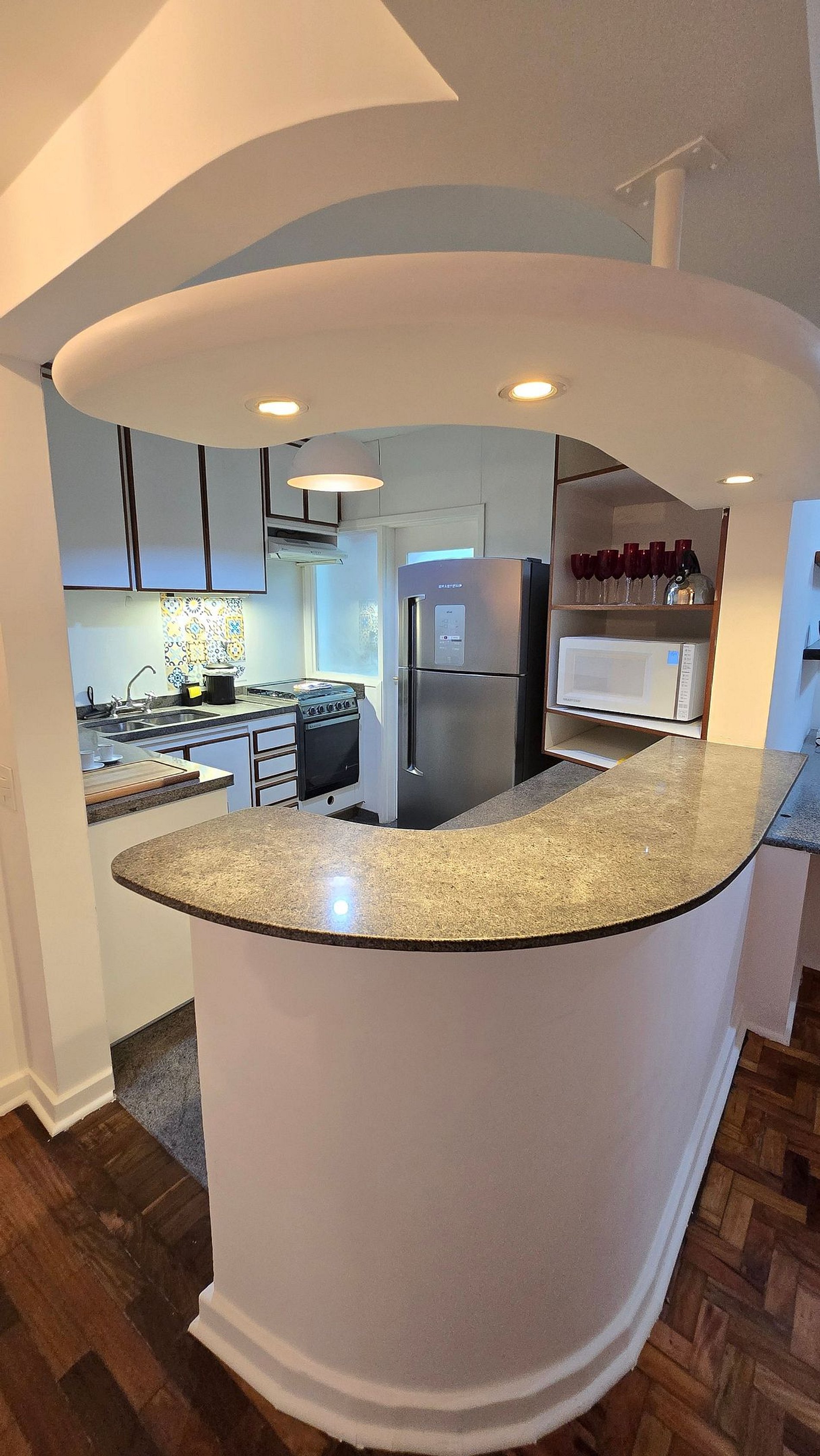 • Cozinha americana completa em utensílios equipada com geladeira grande adequada para longas estadias , fogão 4 bocas com forno, micro-ondas, liquidificador, Cafeteira, sanduicheira, panelas e utensílios de qualidade.