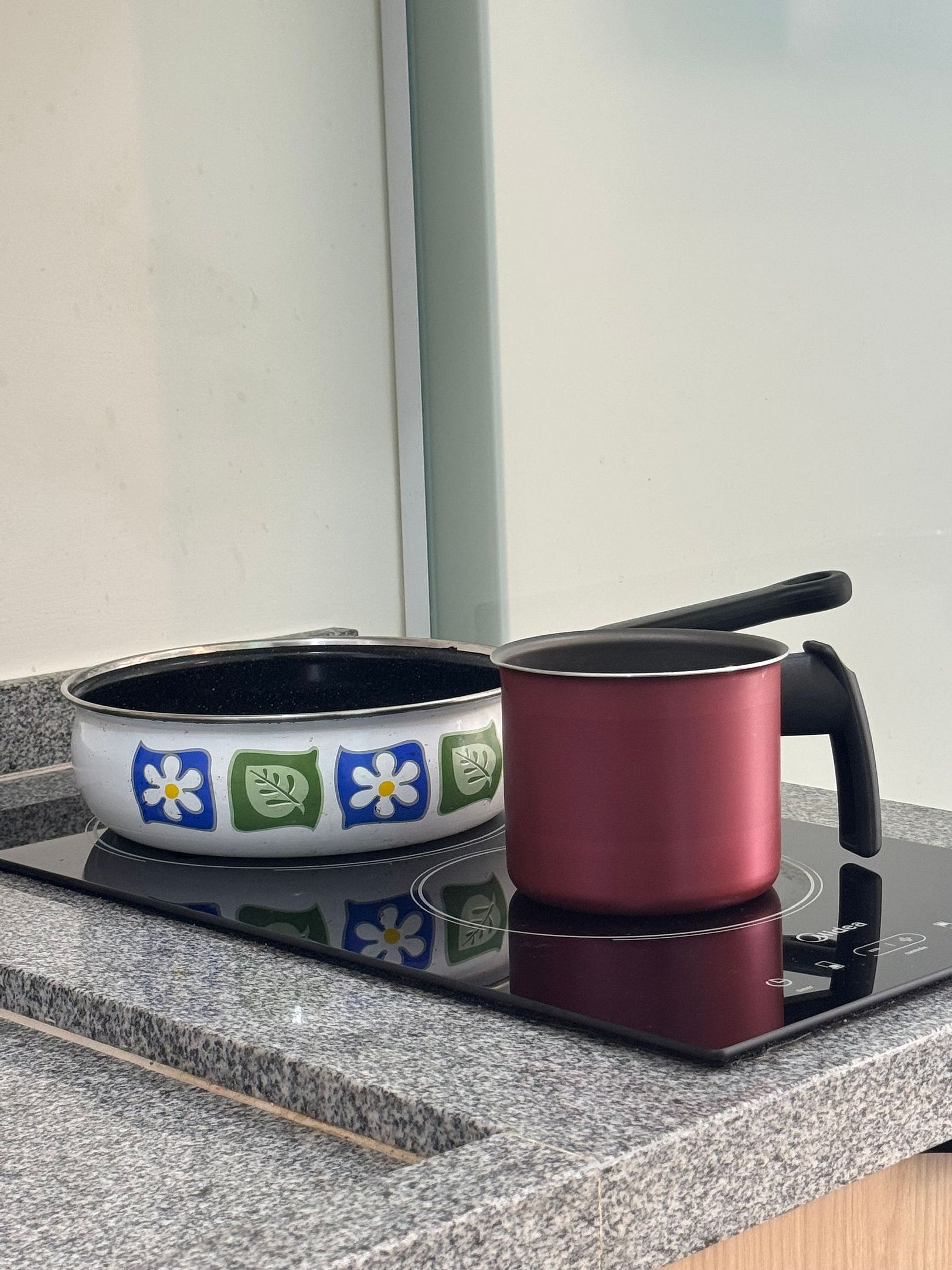 • Cozinha completa equipada com geladeira grande adequada para longas estadias , fogão 2 bocas , micro-ondas, panelas, louças e talheres