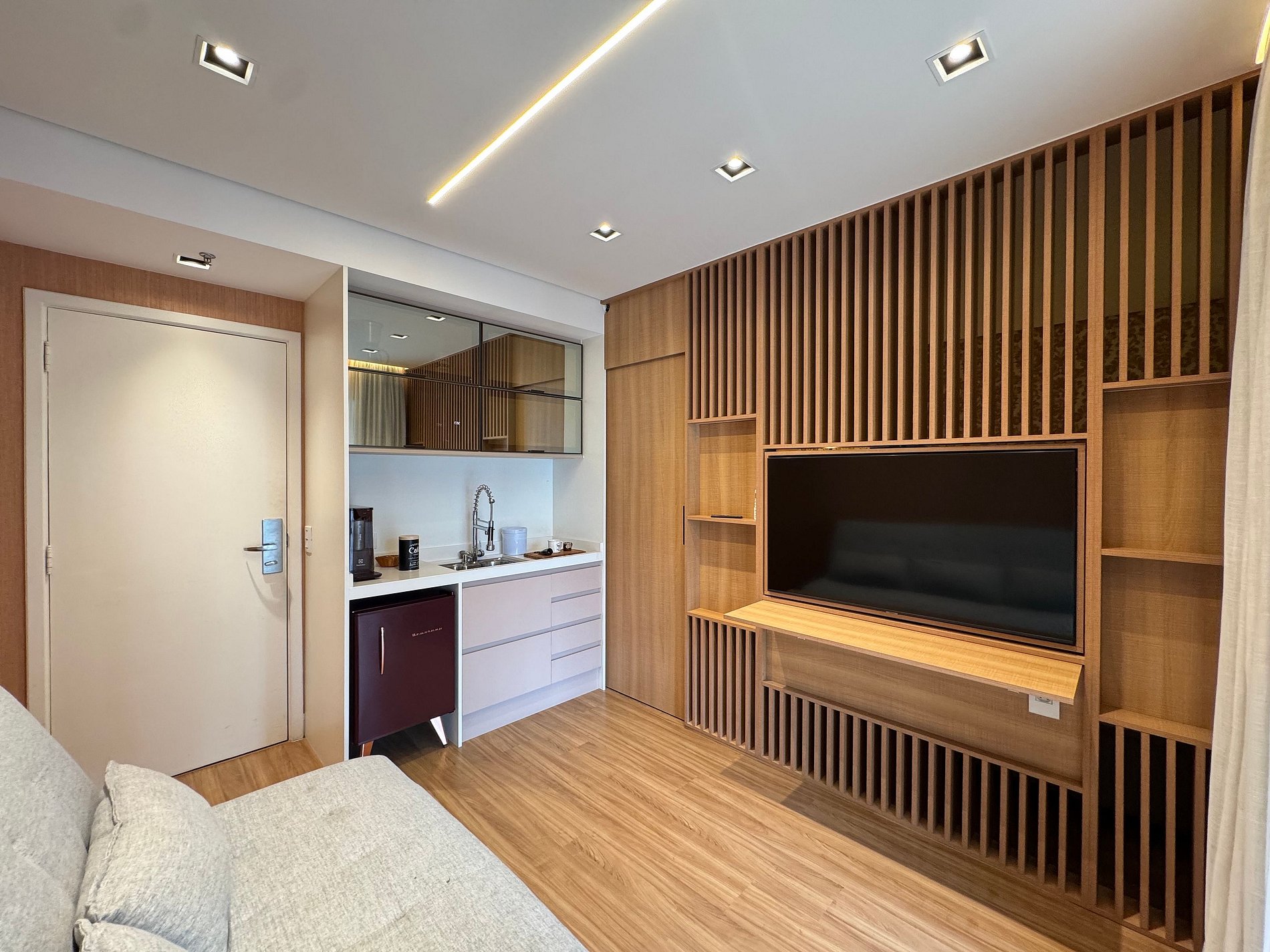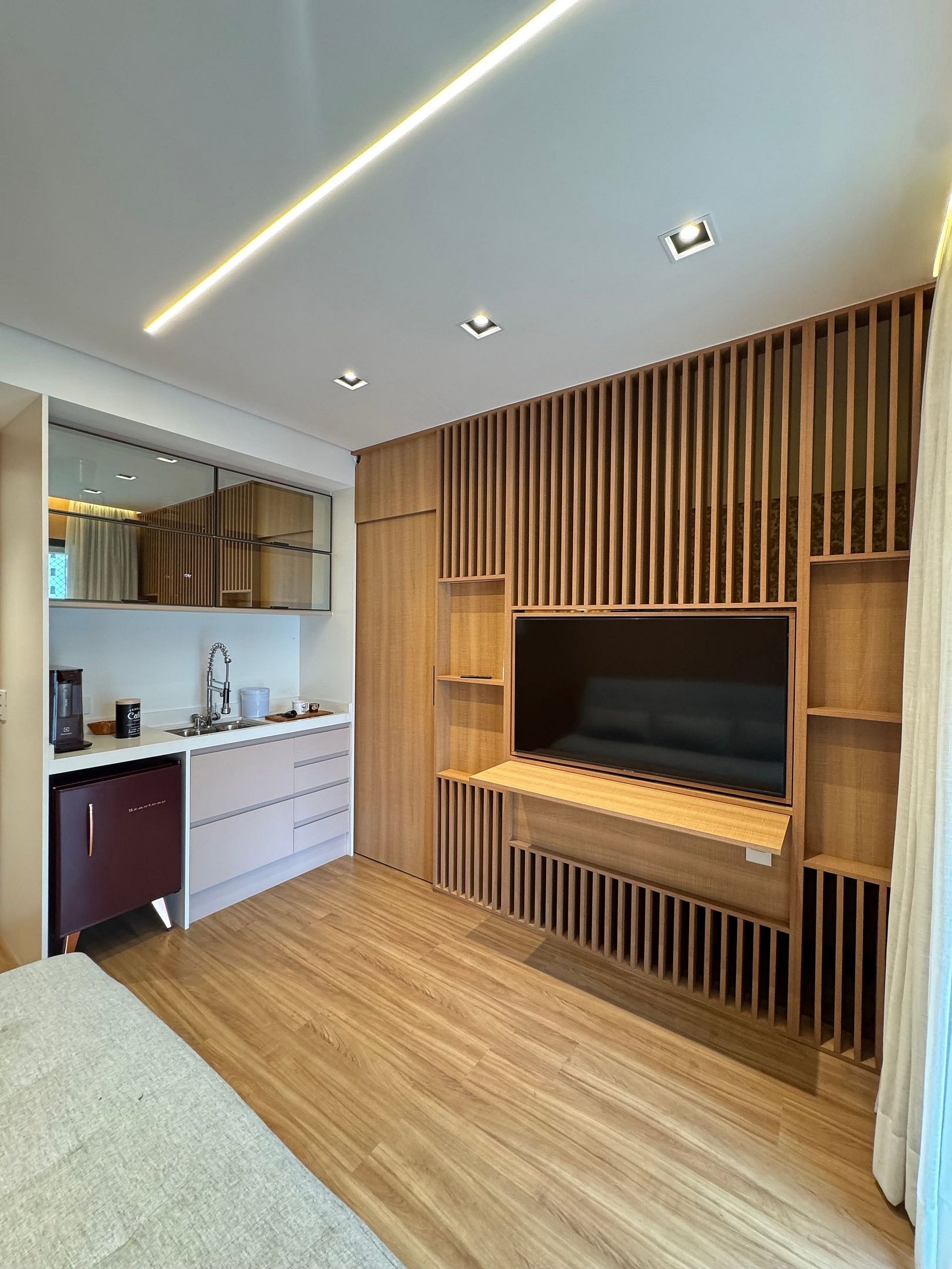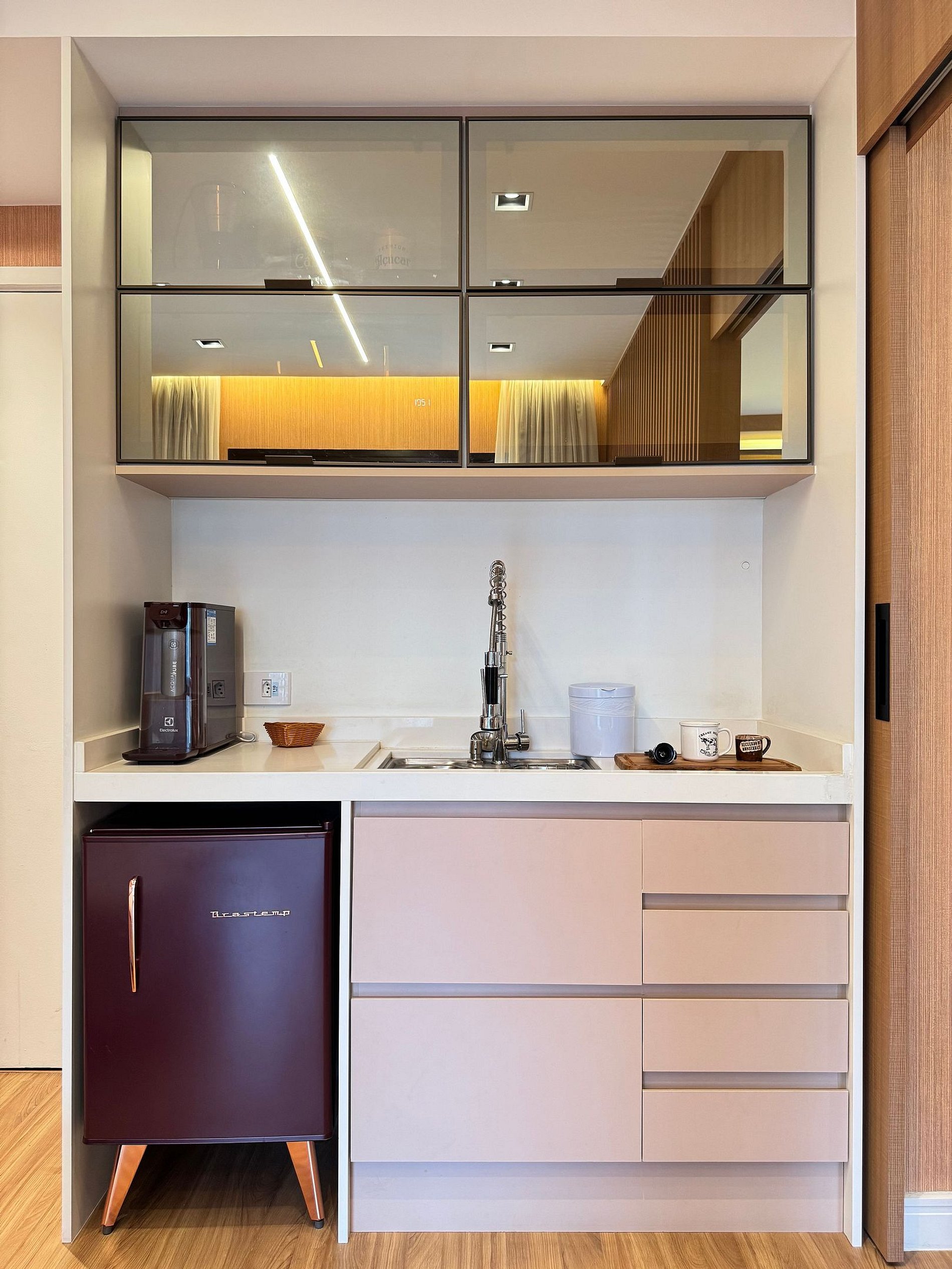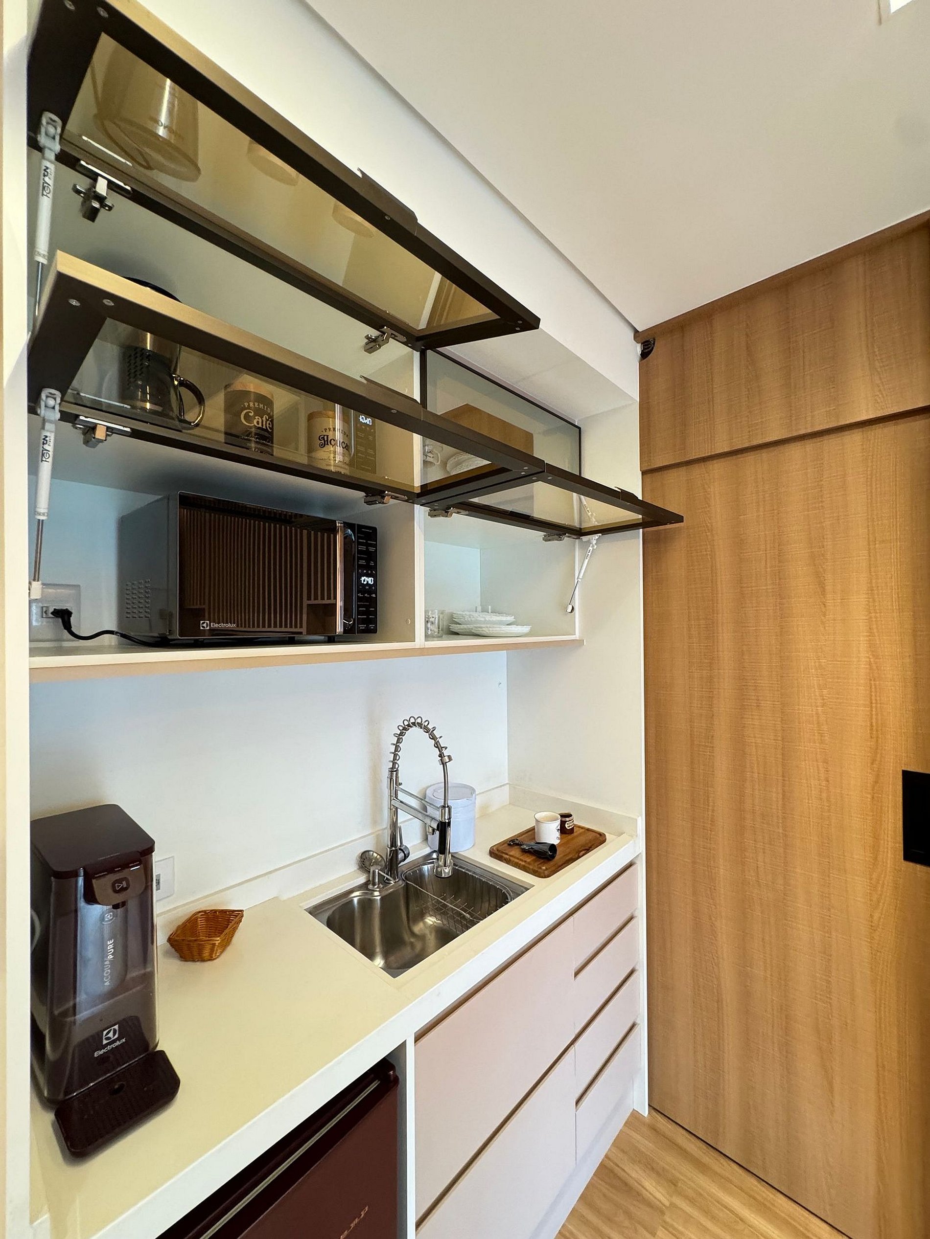 • Cozinha compacta, com frigobar, microondas, louças e talheres de qualidade.
