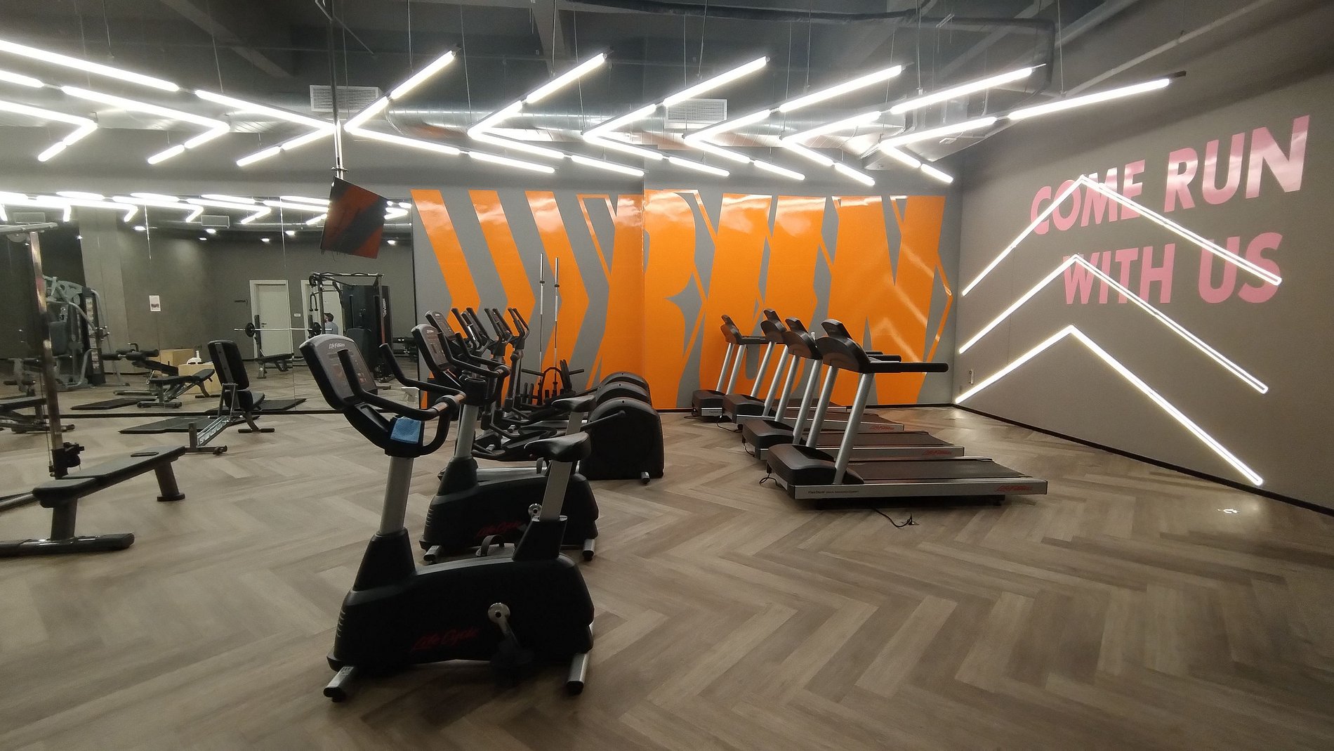 • Uma Big academia rica em aparelhos e bicicletas.