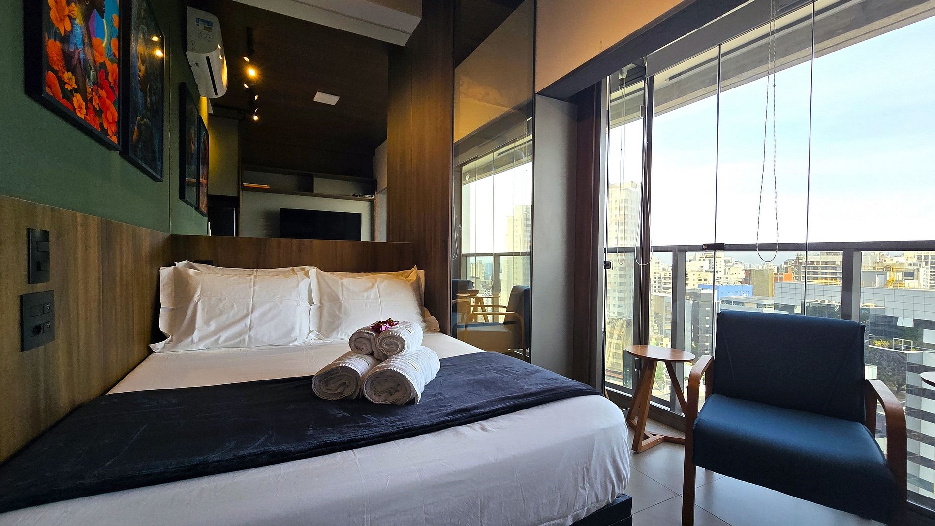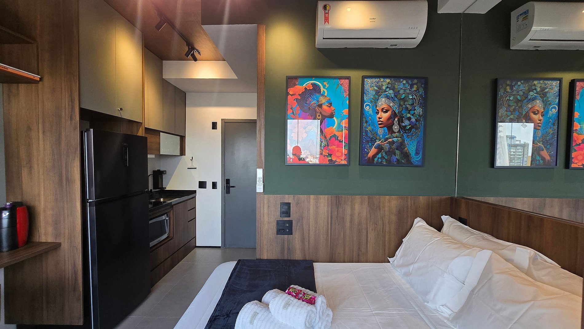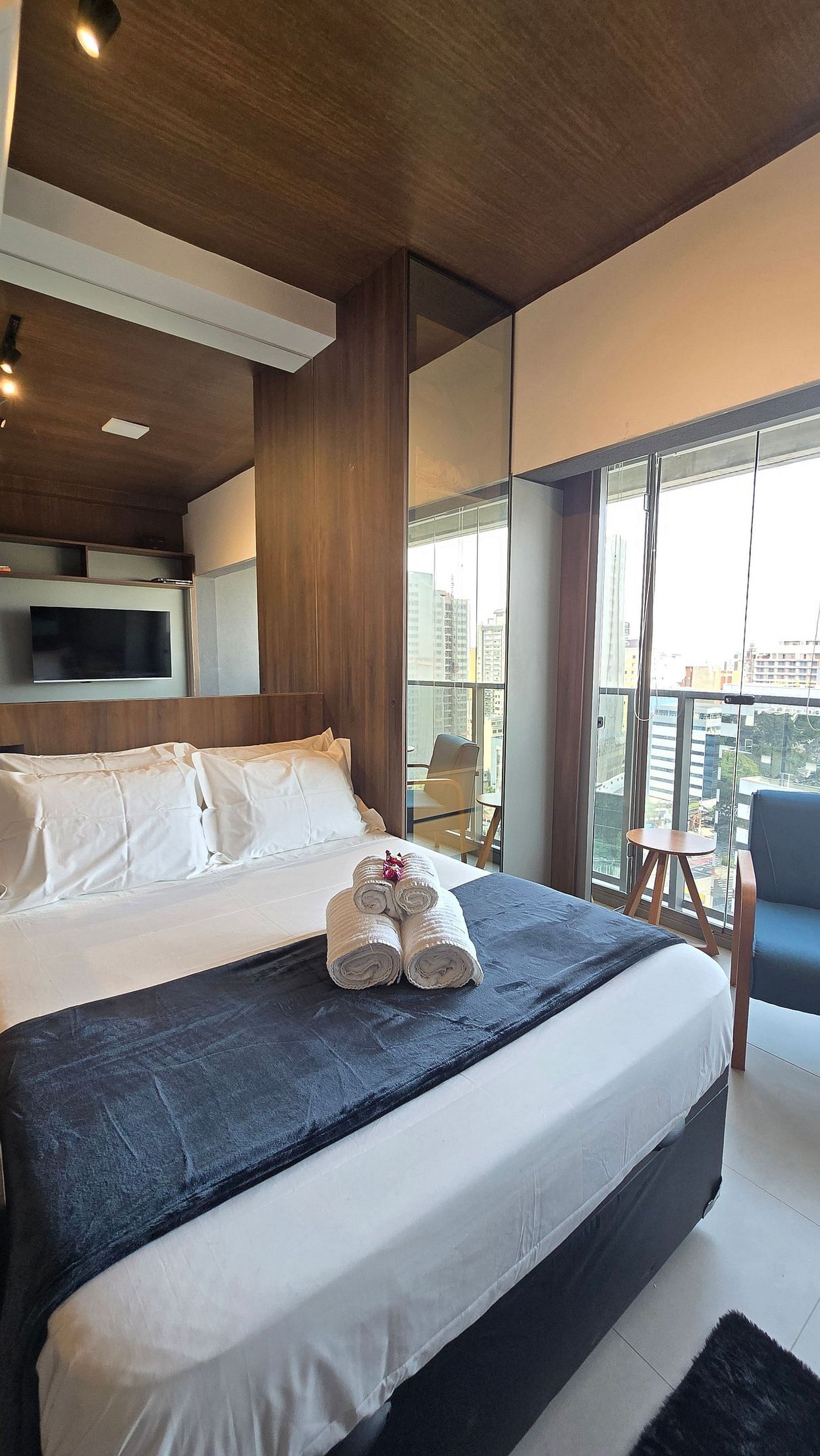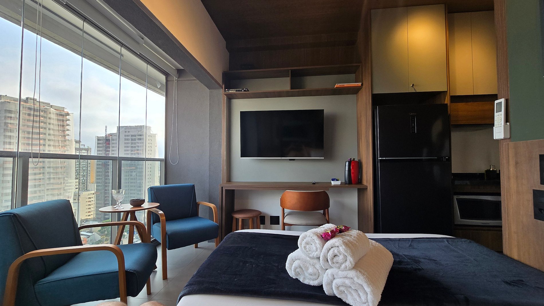 O apartamento está localizado no Paraiso, um dos melhores bairros de São Paulo a apenas 1 minuto de caminhada do metro paraíso. A 5 minutos a pé da paulista e 20 do parque Ibirapuera. O apartamento é aconchegante e completo e conta com uma cama de casal , sacada integrada com poltrona e mesa de centro para duas pessoas e uma bela vista voltada para cidade de São Paulo. É bem iluminado, com decoração em tons de madeira escura , um estúdio elegante e funcional. Tem cozinha completa e bem equipada com geladeira Eletrolux , fogão cocktop 2 bocas, micro-ondas, liquidificador , panelas e demais utensílios. Smart Tv , wi-fi de alta velocidade e espaço para trabalho. Esta unidade ainda conta com Ar Condicionado , enxoval de cama e banho completo.