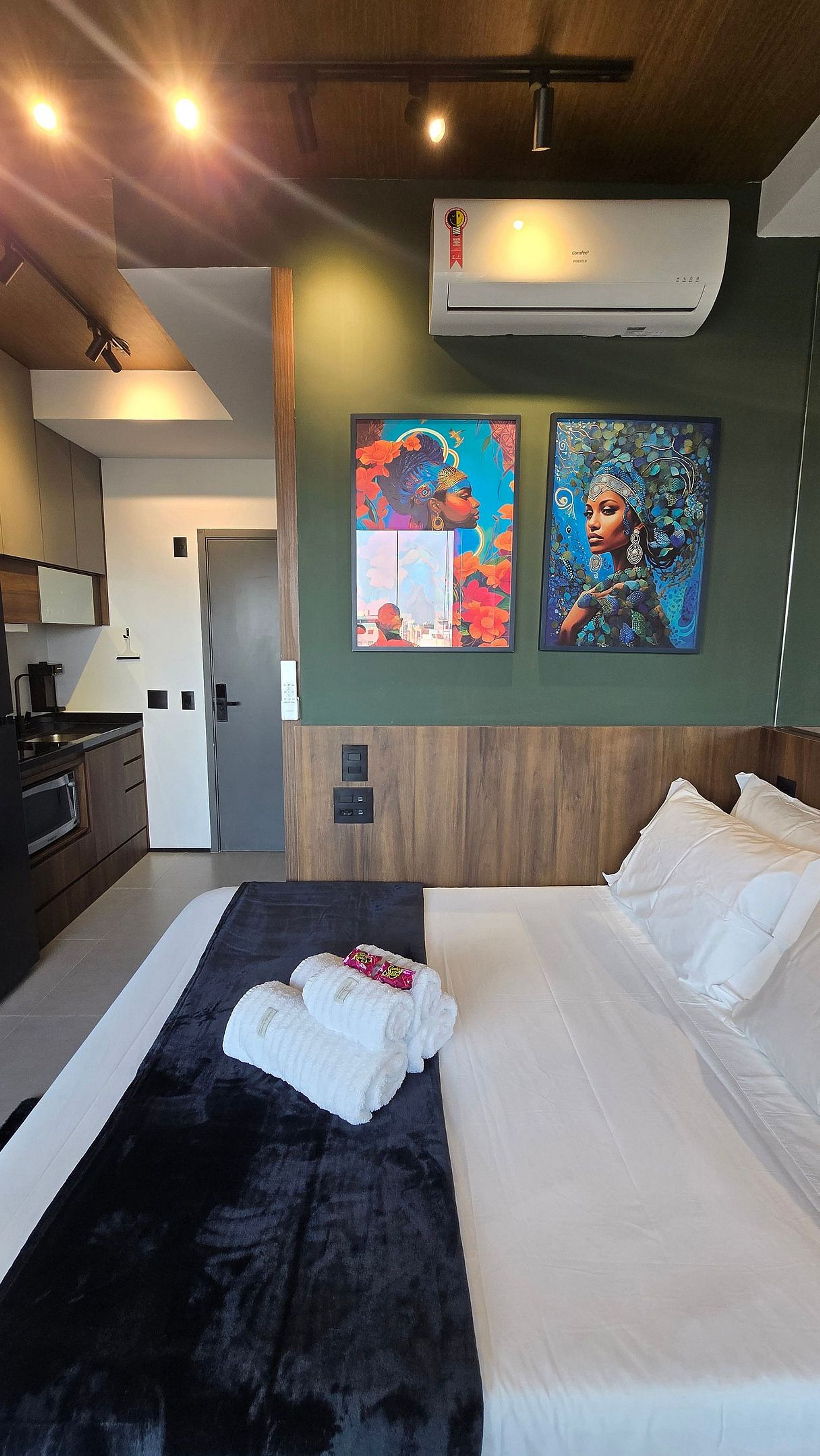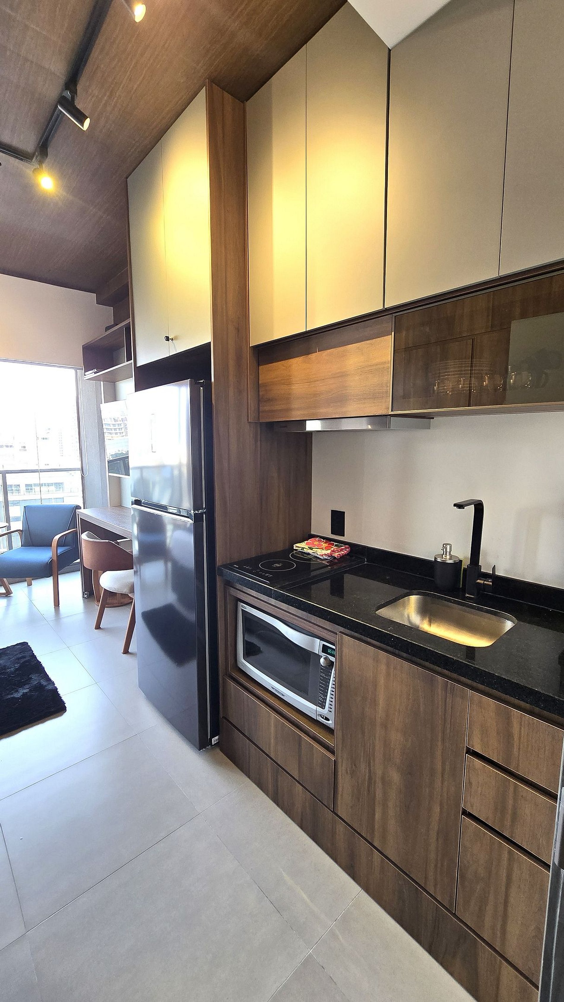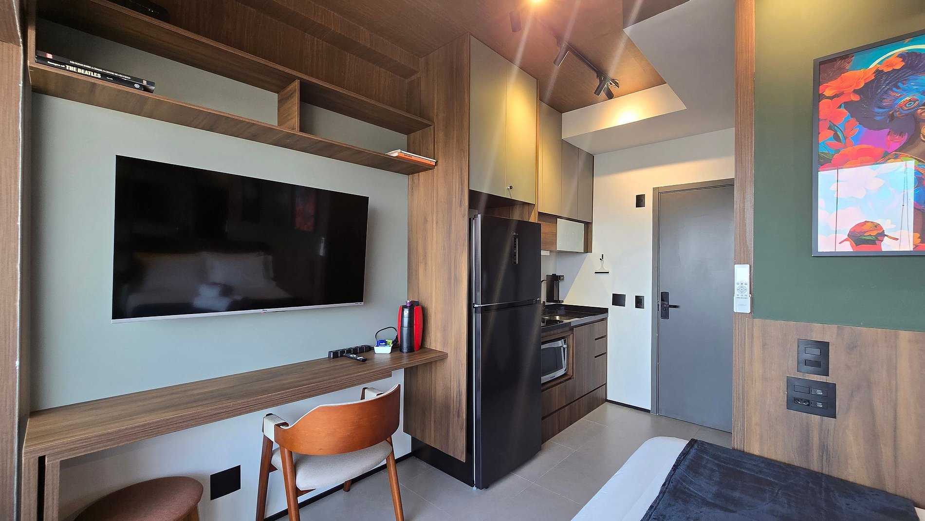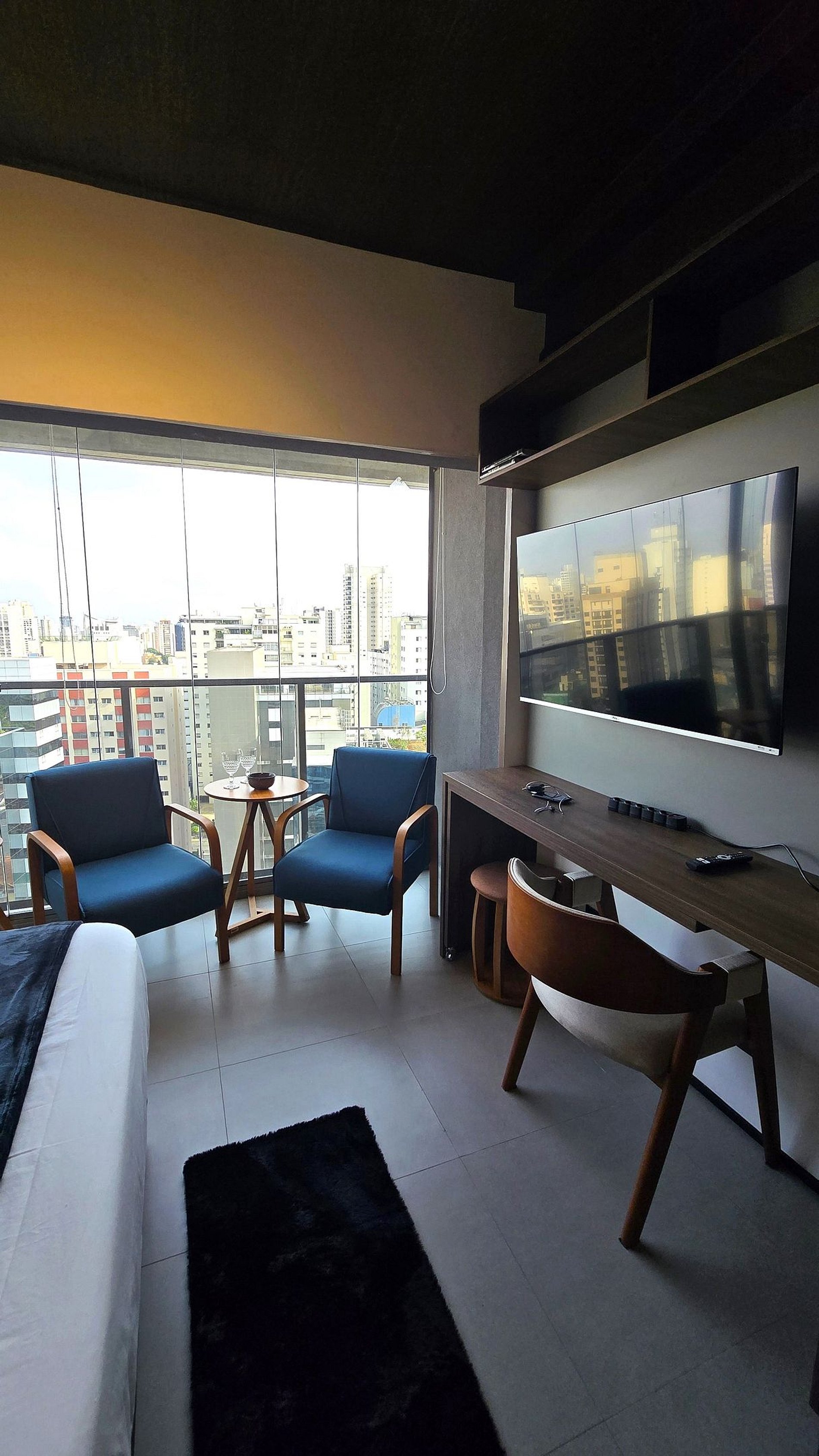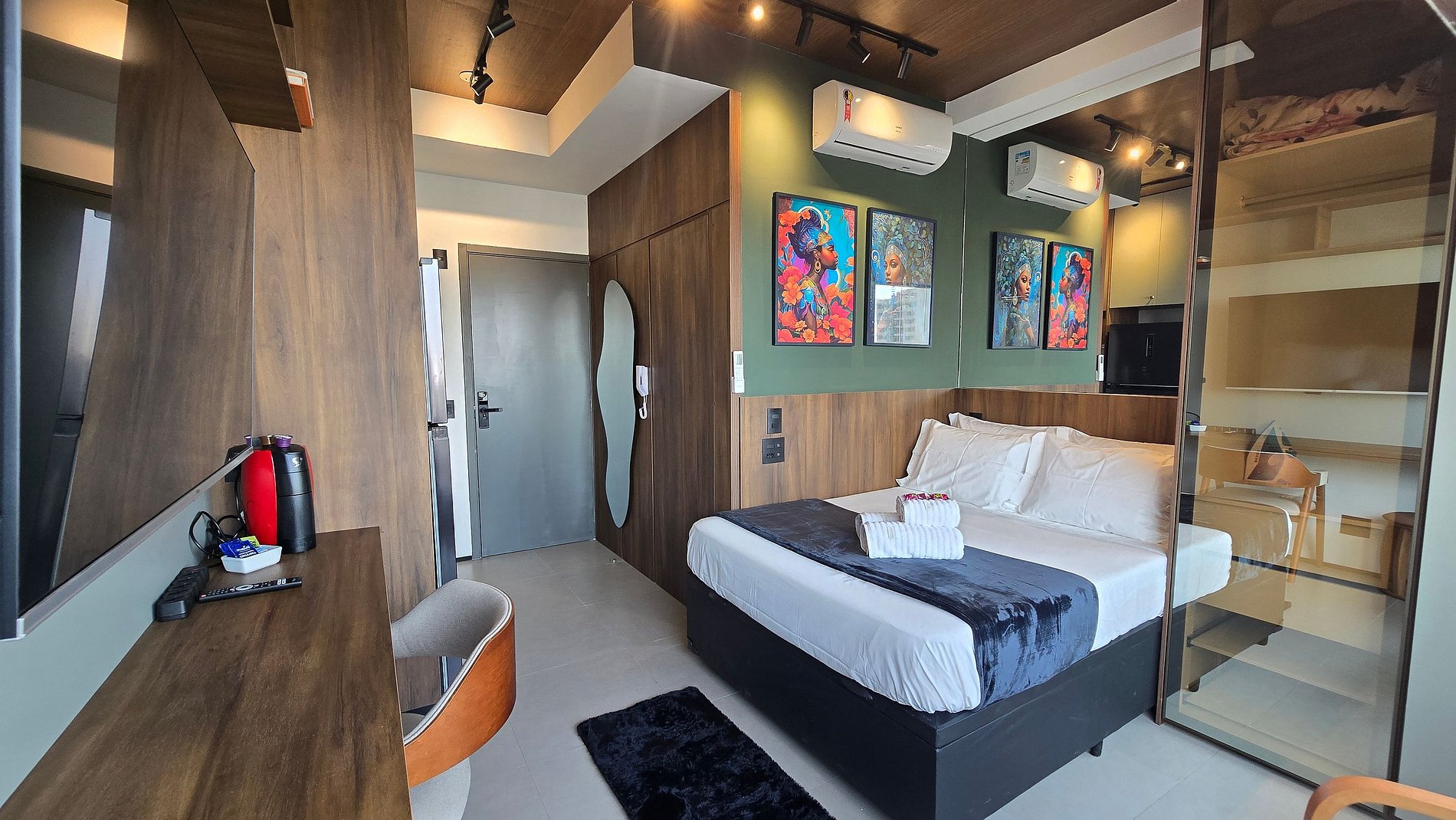 O apartamento está localizado no Paraiso, um dos melhores bairros de São Paulo a apenas 1 minuto de caminhada do metro paraíso. A 5 minutos a pé da paulista e 20 do parque Ibirapuera. O apartamento é aconchegante e completo e conta com uma cama de casal , sacada integrada com poltrona e mesa de centro para duas pessoas e uma bela vista voltada para cidade de São Paulo. É bem iluminado, com decoração em tons de madeira escura , um estúdio elegante e funcional. Tem cozinha completa e bem equipada com geladeira Eletrolux , fogão cocktop 2 bocas, micro-ondas, liquidificador , panelas e demais utensílios. Smart Tv , wi-fi de alta velocidade e espaço para trabalho. Esta unidade ainda conta com Ar Condicionado , enxoval de cama e banho completo.