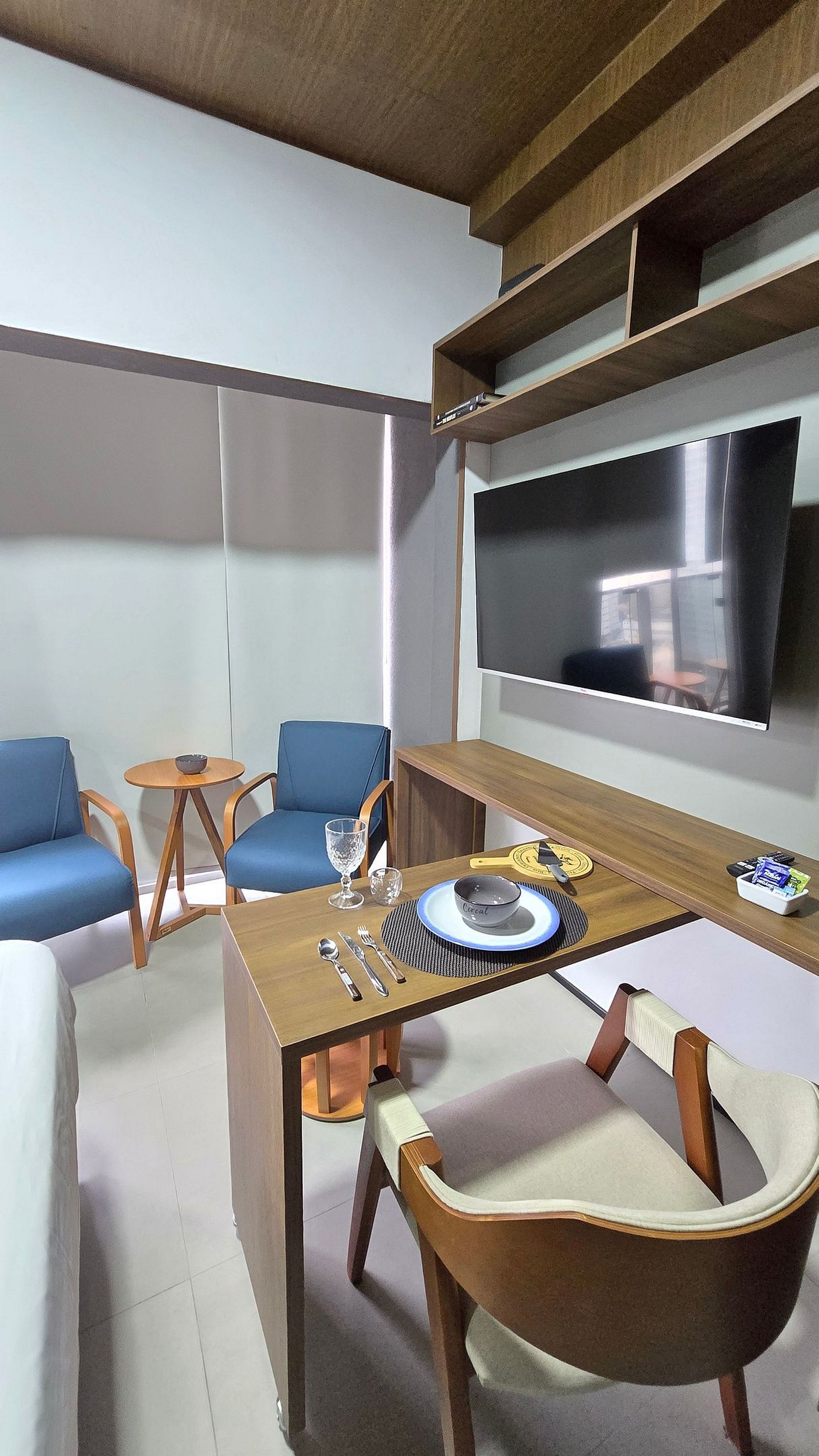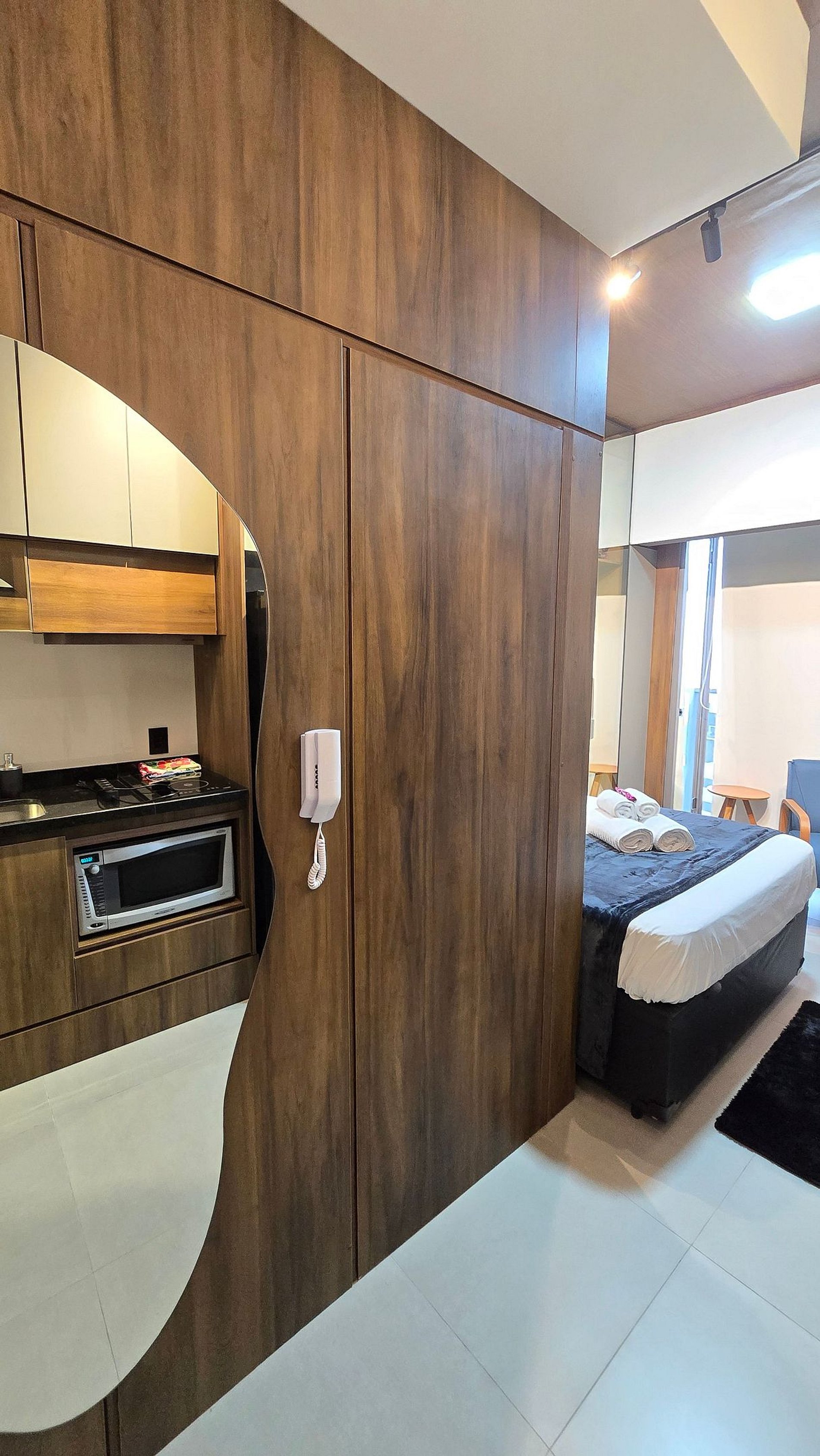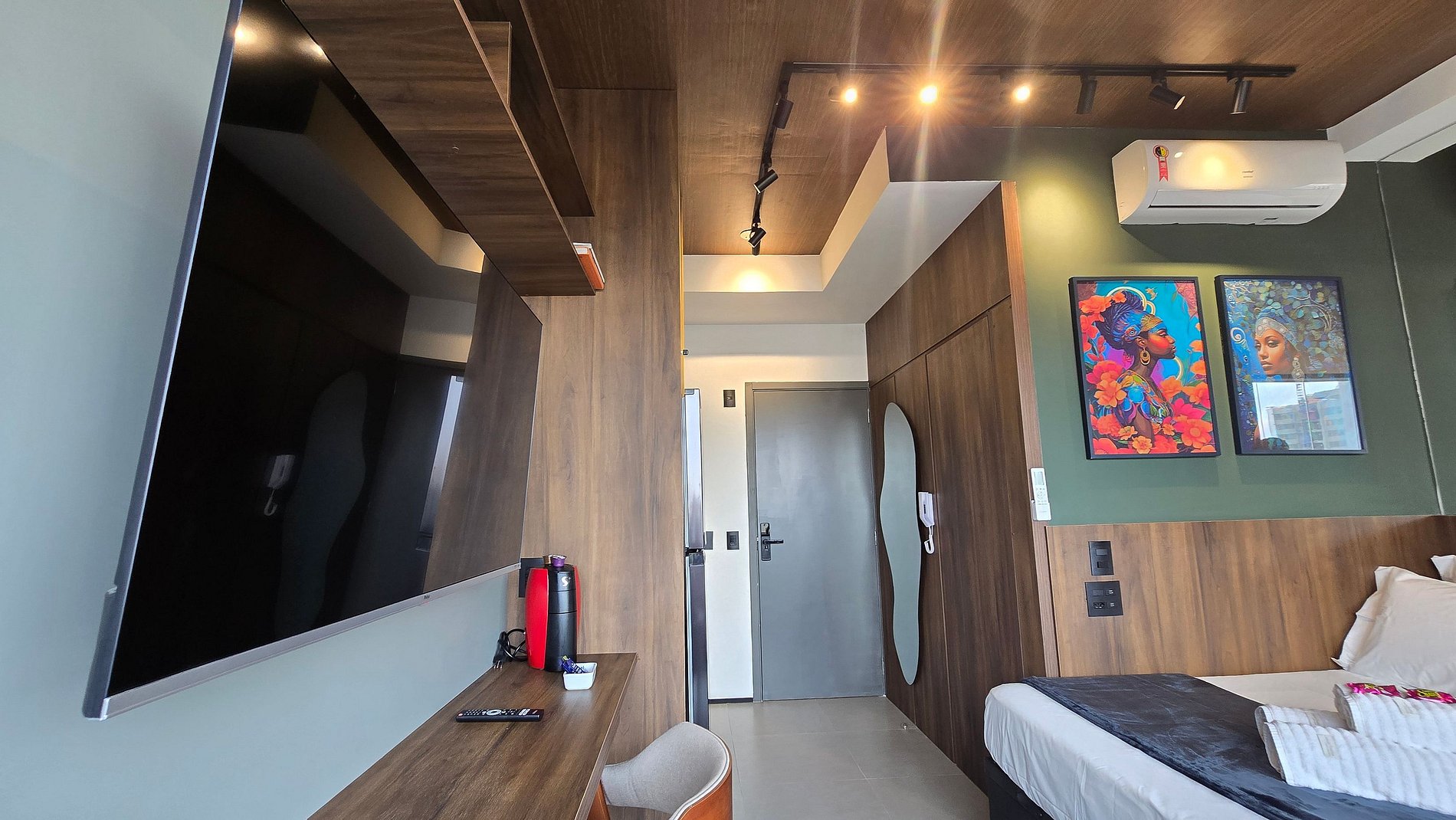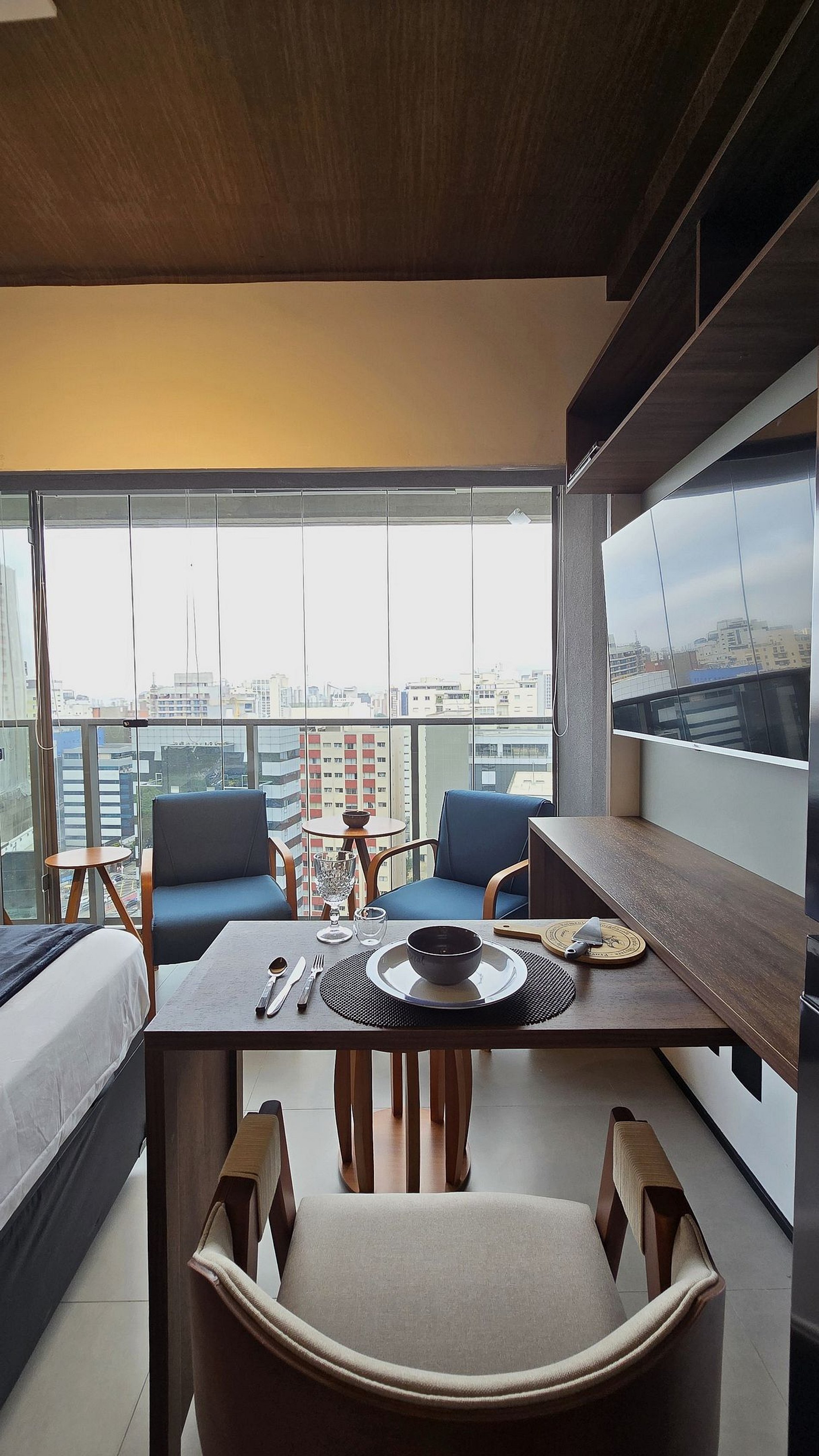 O apartamento está localizado no Paraiso, um dos melhores bairros de São Paulo a apenas 1 minuto de caminhada do metro paraíso. A 5 minutos a pé da paulista e 20 do parque Ibirapuera. O apartamento é aconchegante e completo e conta com uma cama de casal , sacada integrada com poltrona e mesa de centro para duas pessoas e uma bela vista voltada para cidade de São Paulo. É bem iluminado, com decoração em tons de madeira escura , um estúdio elegante e funcional. Tem cozinha completa e bem equipada com geladeira Eletrolux , fogão cocktop 2 bocas, micro-ondas, liquidificador , panelas e demais utensílios. Smart Tv , wi-fi de alta velocidade e espaço para trabalho. Esta unidade ainda conta com Ar Condicionado , enxoval de cama e banho completo.
