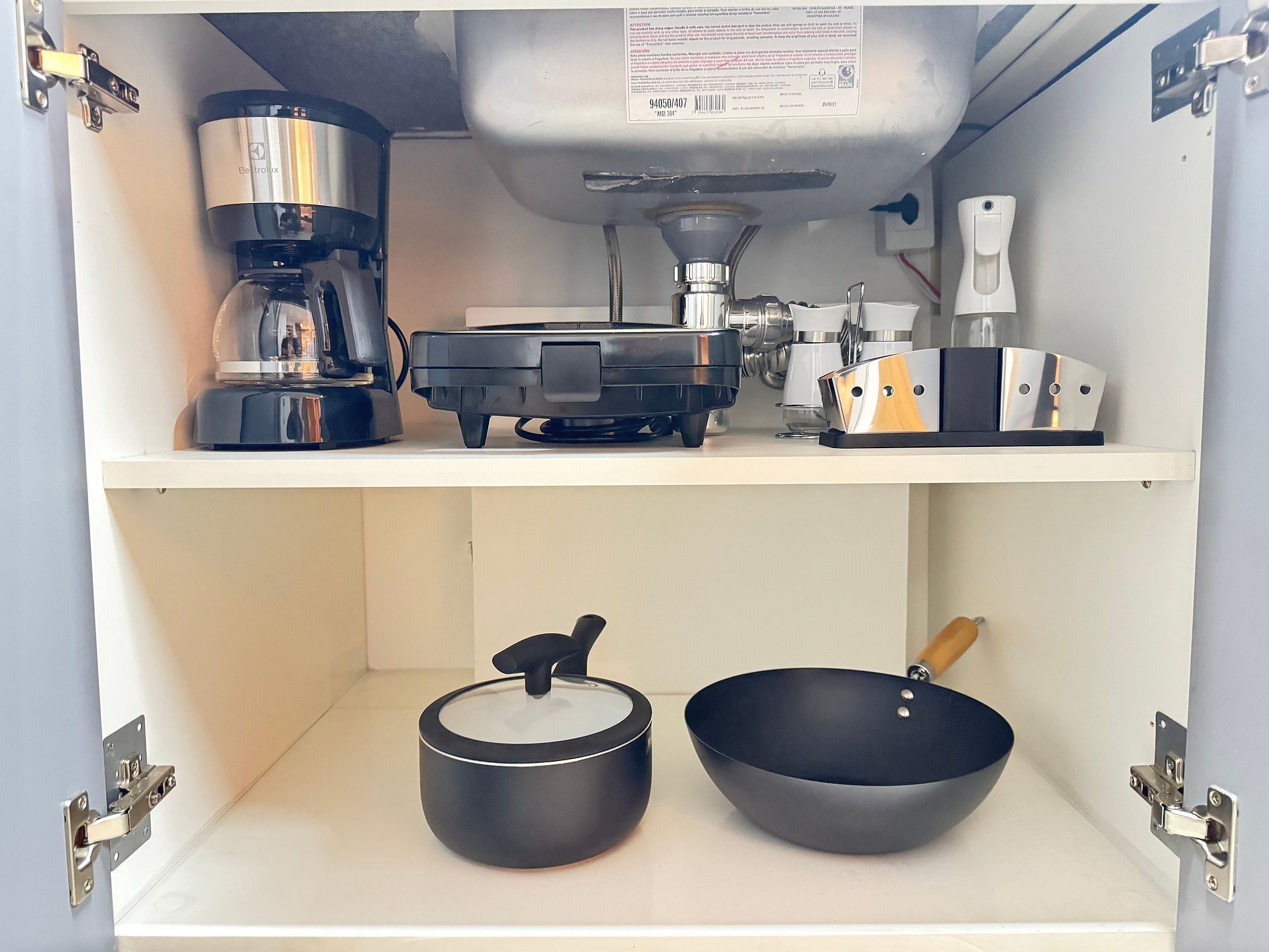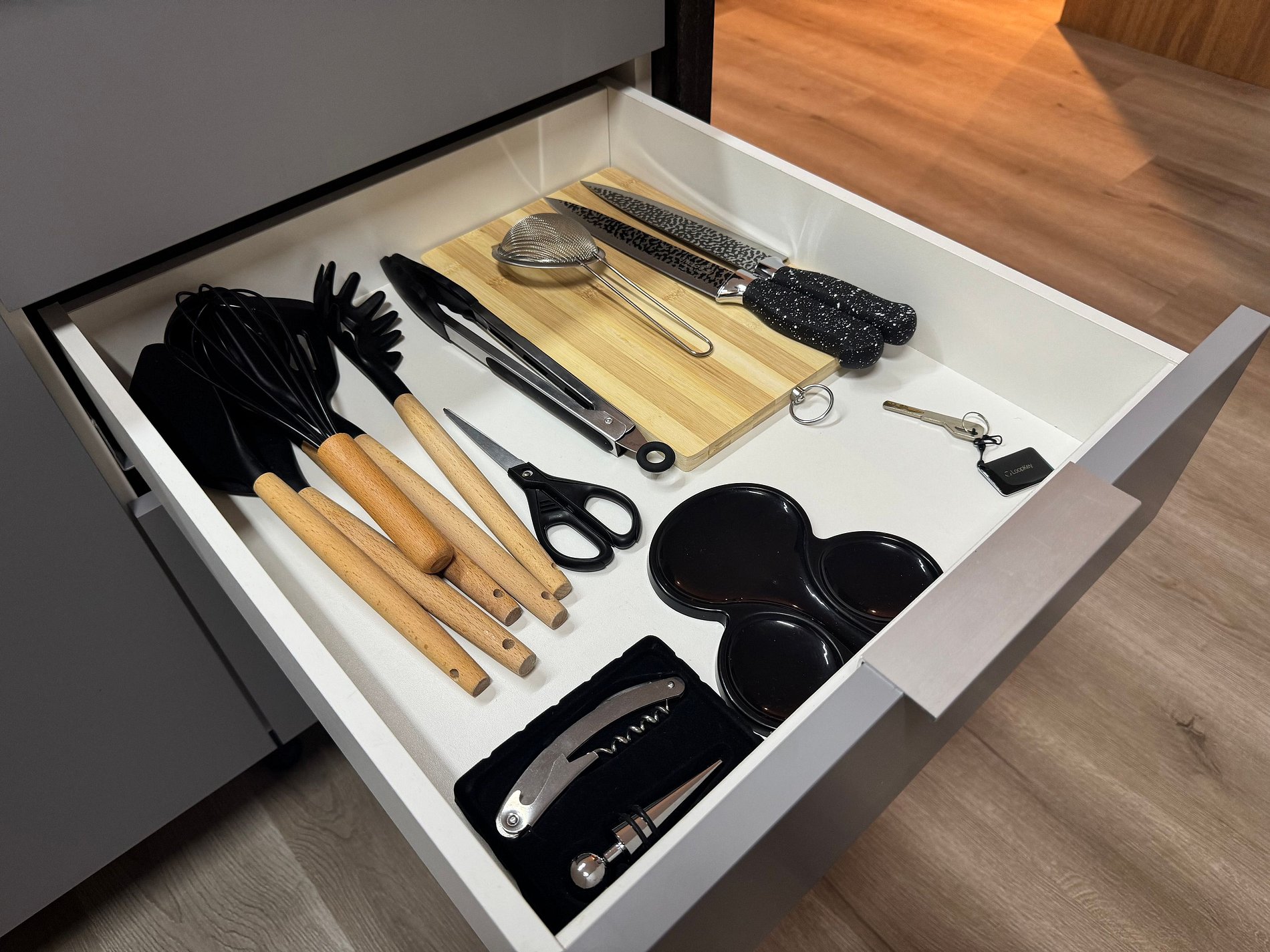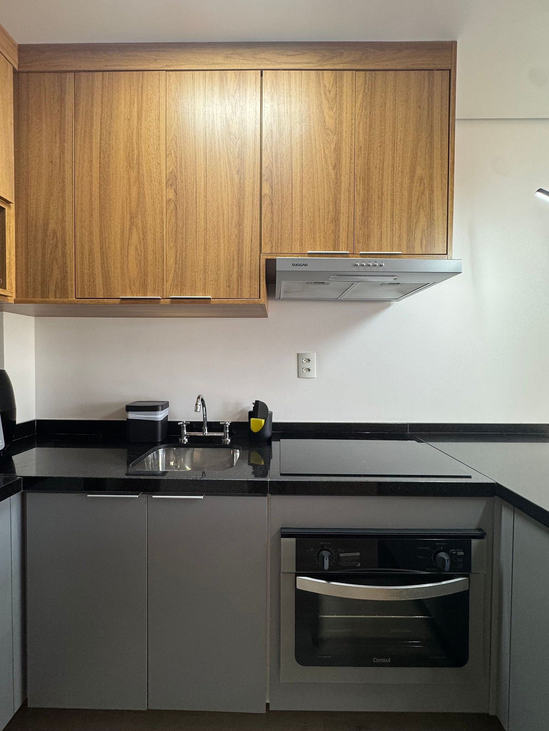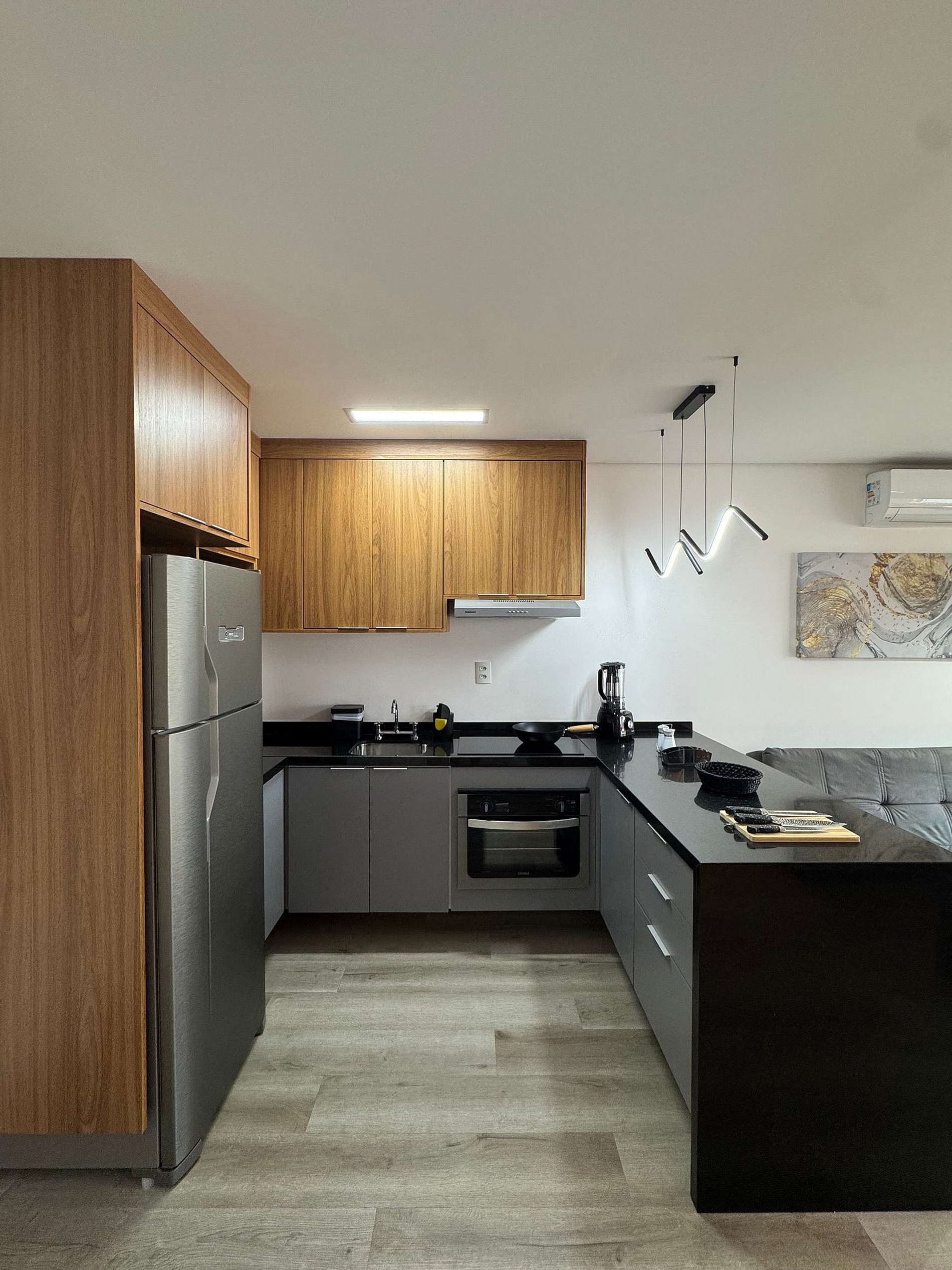 • Cozinha completa com fogão cooktop 4 bocas, panelas de qualidade, geladeira grande, forno, microondas, air frier, liquidificador, sanduicheira, maquina de café e chaleira e utensílios de qualidade.