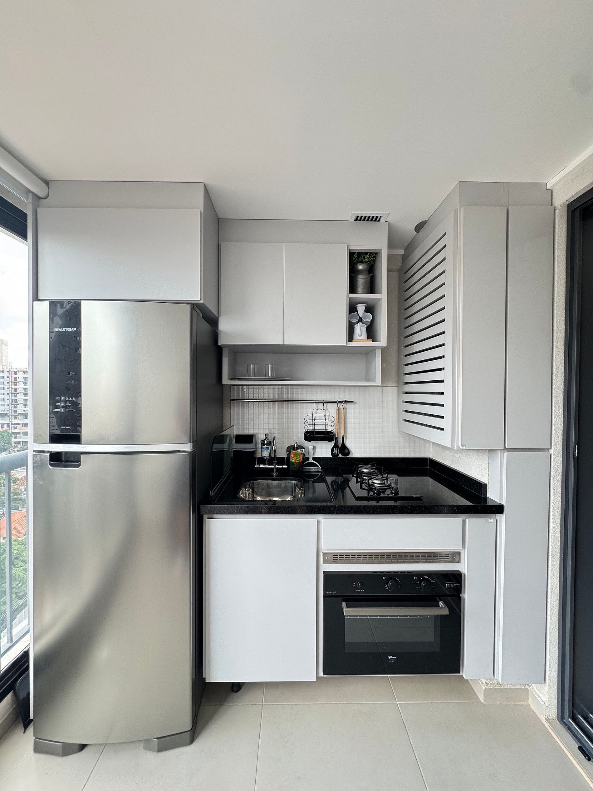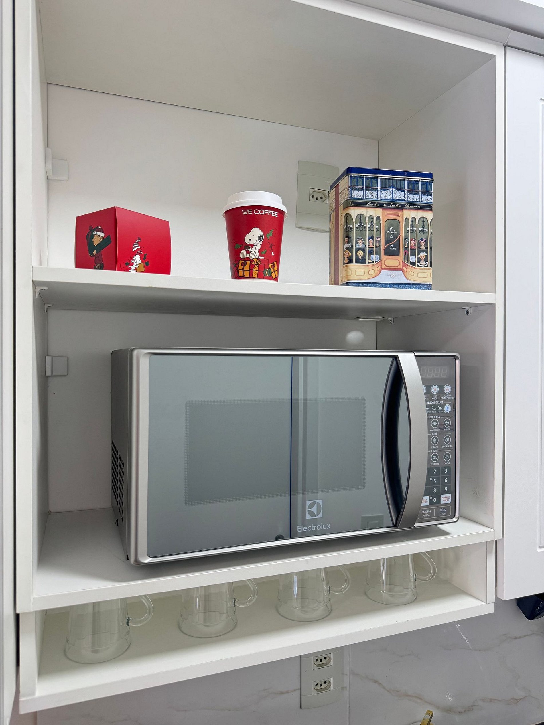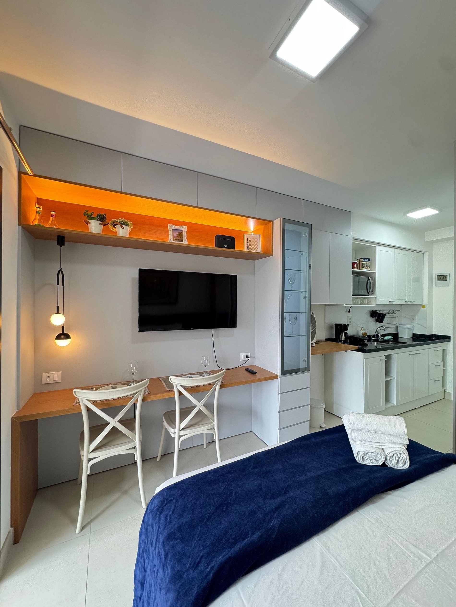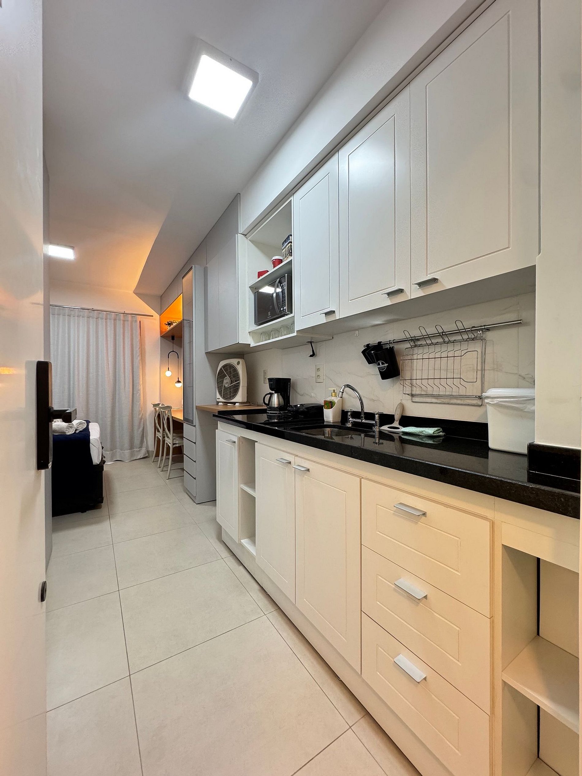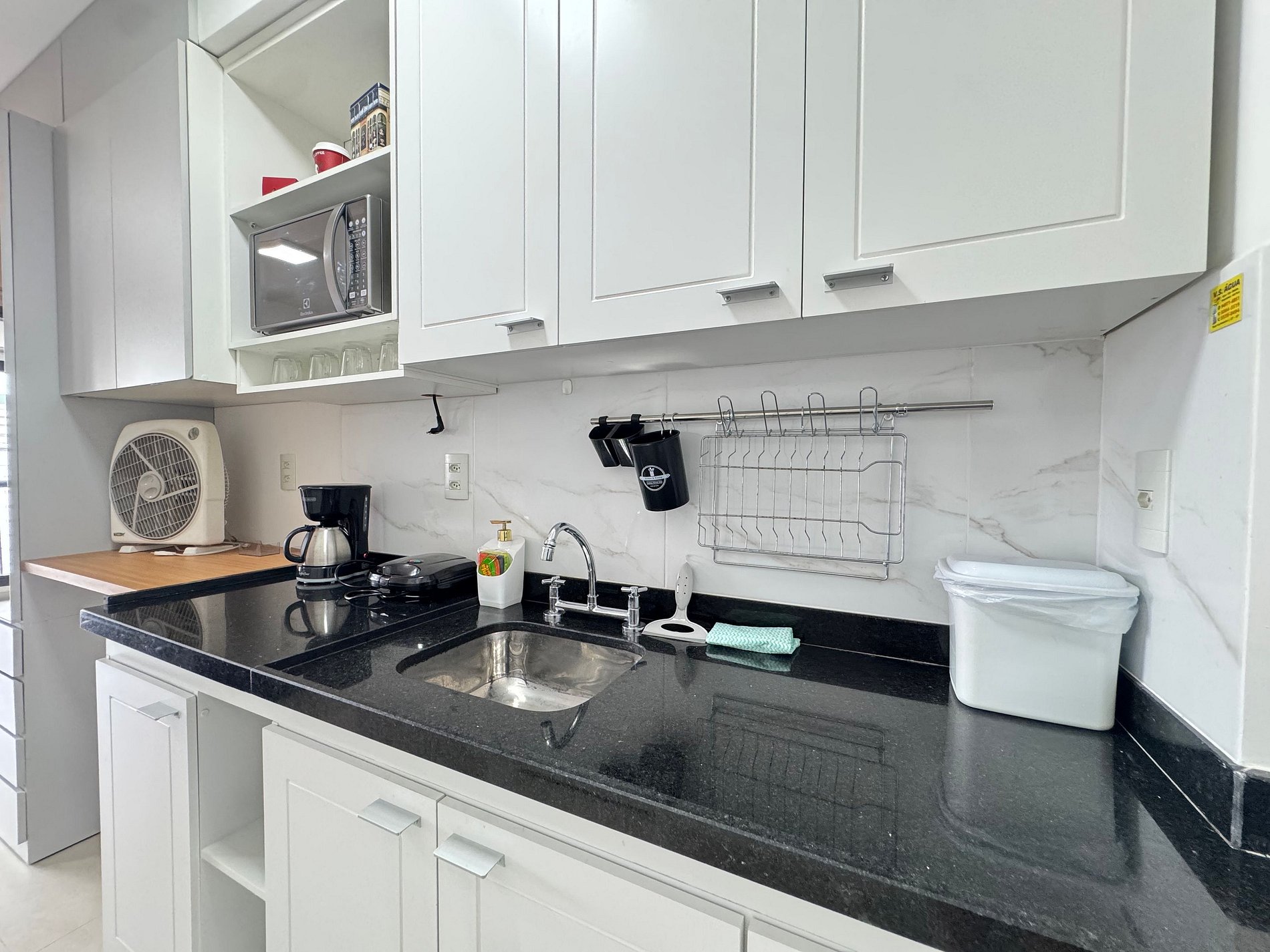 • Cozinha compacta completa, equipada com, fogão cooktop 2 bocas, forno elétrico, liquidificador, máquina de café, sanduicheira, microodas, panelas e demais utensílios.