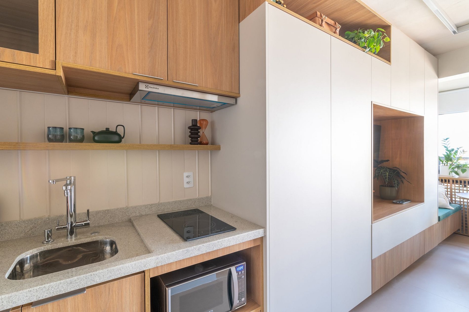 • Cozinha completa e espaçosa rica em armários equipada com Geladeira Eletrolux Grande , fogão cocktop de duas bocas , máquina de café elétrica, micro-ondas, liquidificador , Chaleira elétrica, sanduicheira e panelas e utensílios de qualidade.