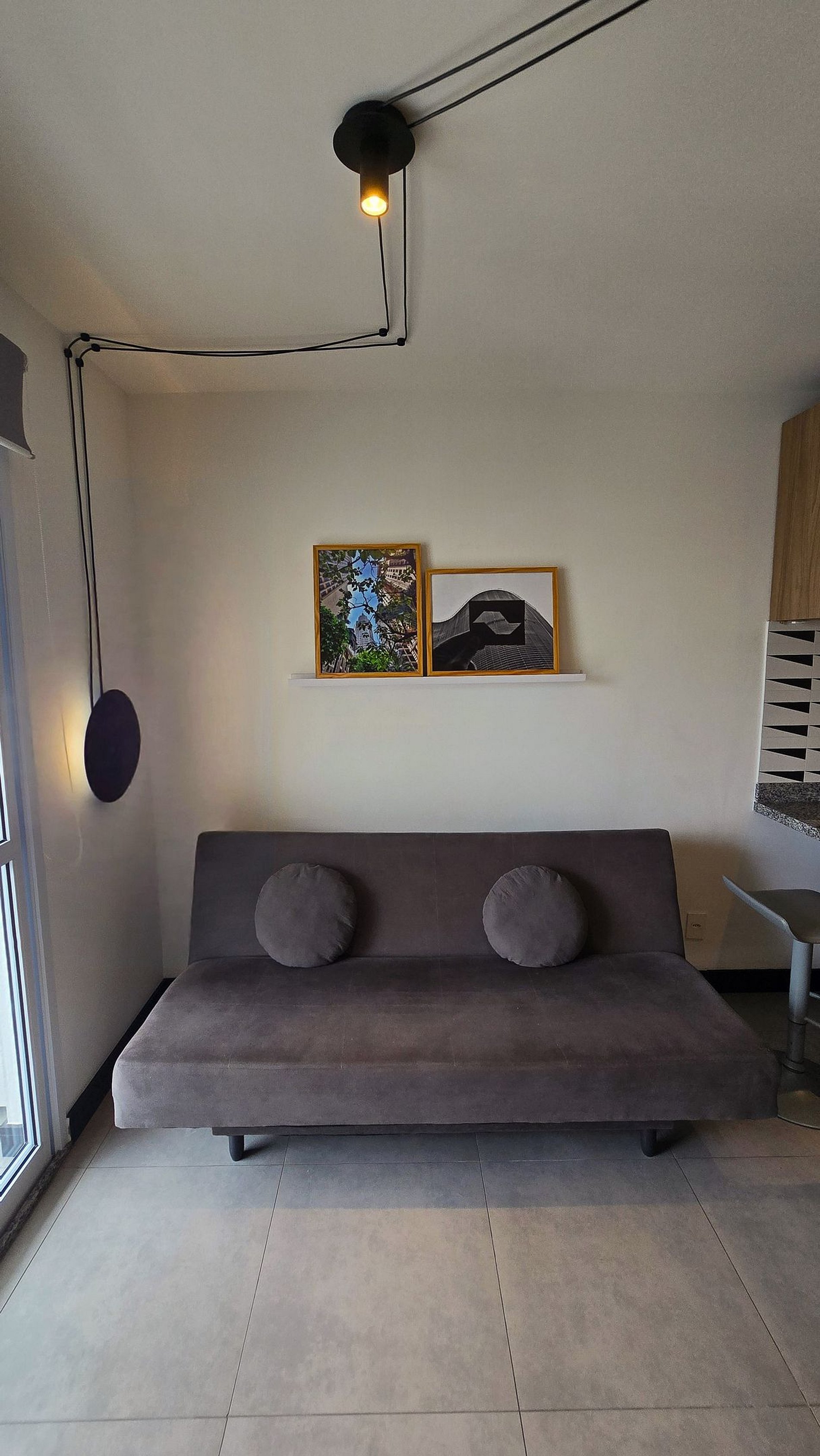 • Área de estar com bancada para duas pessoas e sofá.