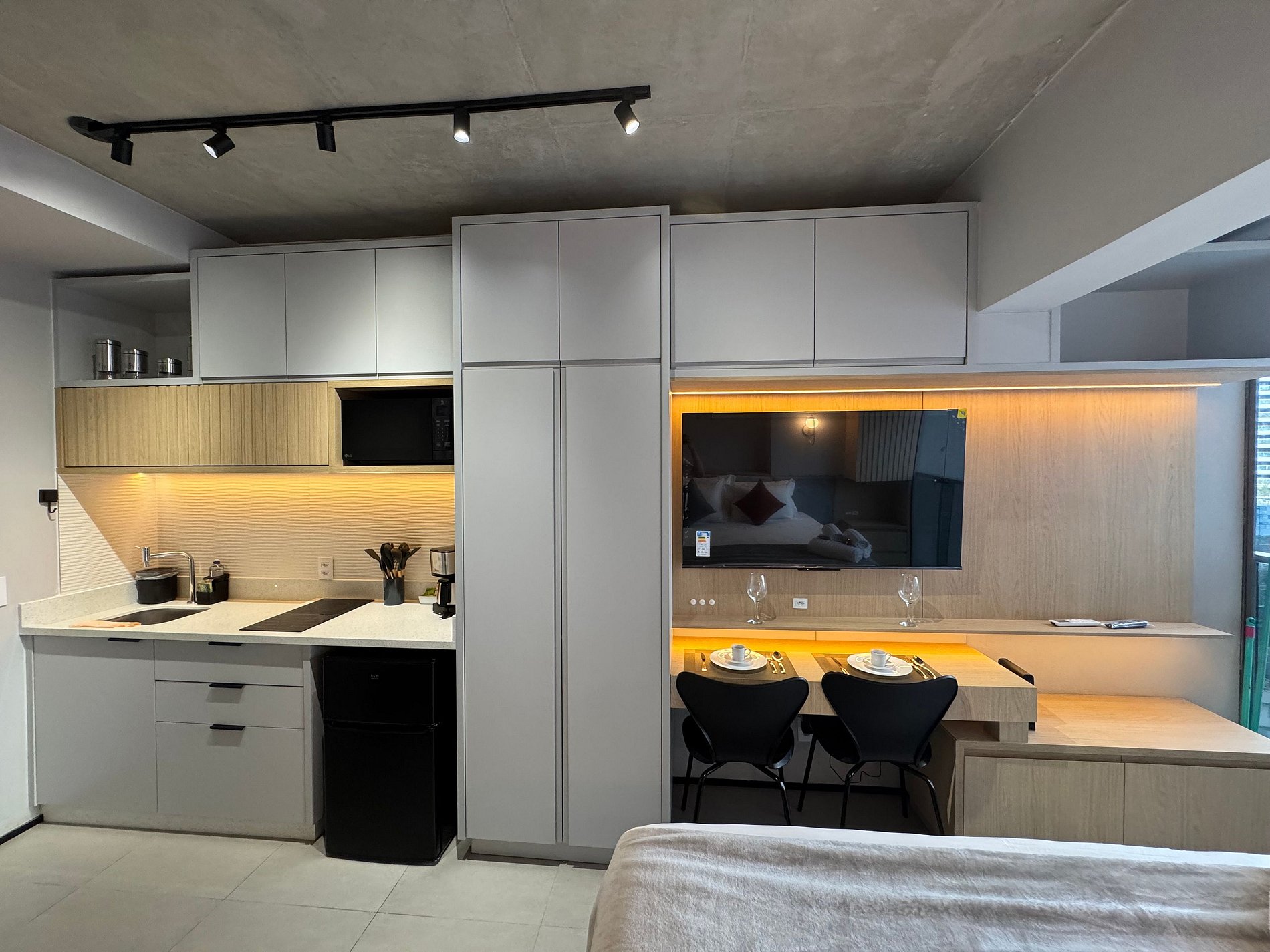 O apartamento está localizado no Paraiso, um dos melhores bairros de São Paulo a apenas 1 minuto de caminhada do metro paraíso, a 5 minutos a pé da paulista e 20 do parque Ibirapuera. O apartamento é aconchegante, completo, e rico em armários. É bem iluminado e conta com uma confortável cama queen, apartamento em tons neutros e madeira clara conferem conforto e harmonia. Este studio conta com cozinha completa e bem equipada com frigobar, fogão cocktop 2 bocas, micro-ondas, cafeteira Dolce Gusto, cafeteira elétrica, panelas e demais utensílios. Smart Tv , wi-fi de alta velocidade e espaço para trabalho. Esta unidade ainda conta com Ar Condicionado , enxoval de cama e banho completo.