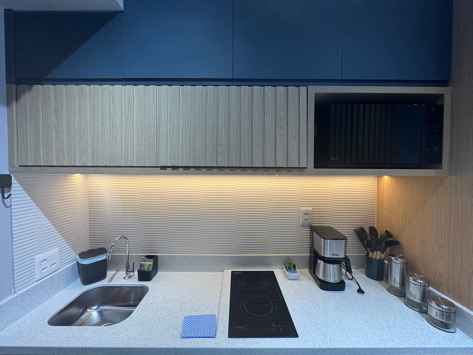 • Cozinha compacta porem completa equipada com fogão coocktop de duas bocas, cafeteira, micro-ondas, panelas e utensílios de qualidade.