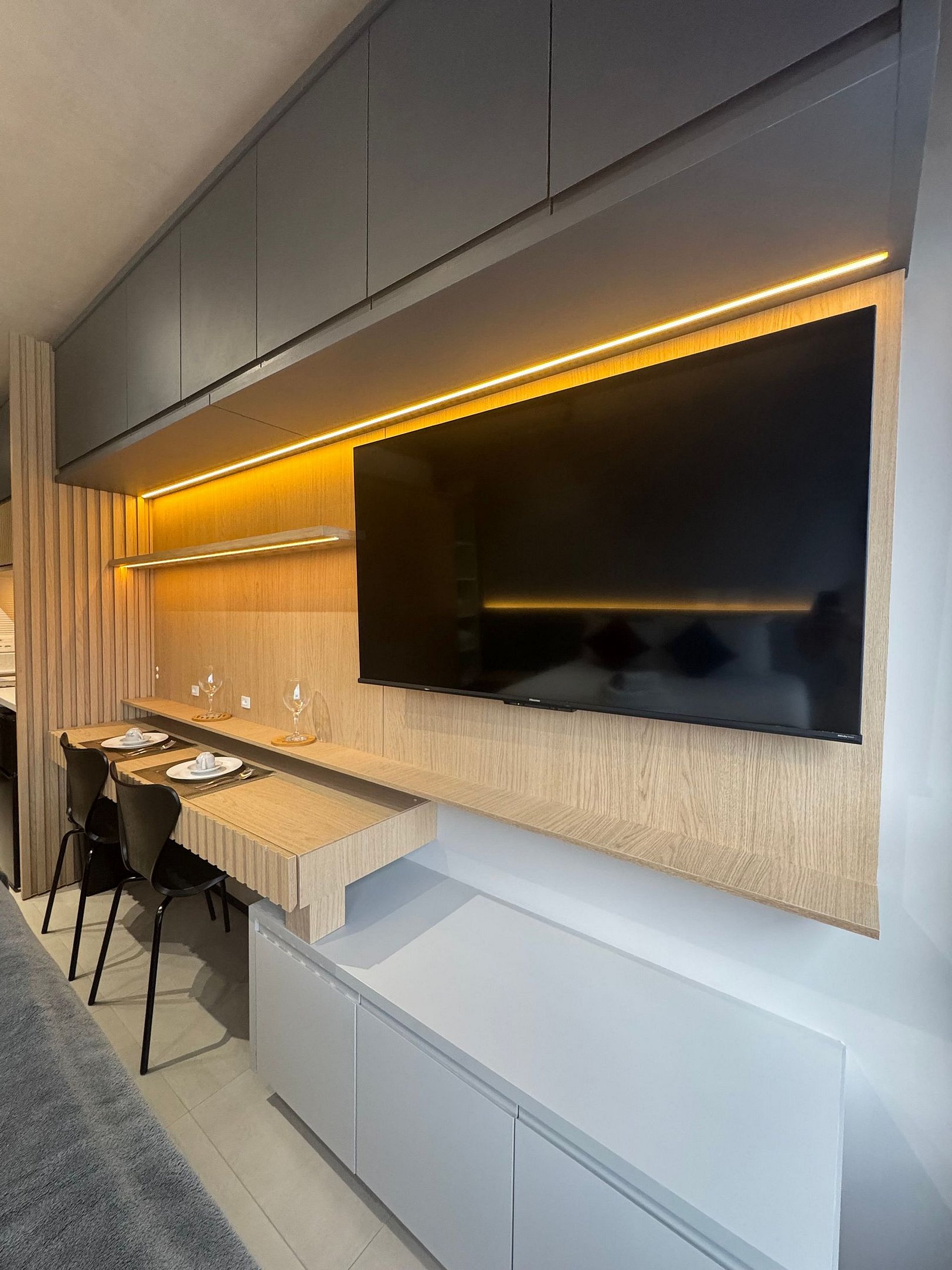 • Cozinha compacta porem completa equipada com fogão coocktop de duas bocas, cafeteira, micro-ondas, panelas e utensílios de qualidade.