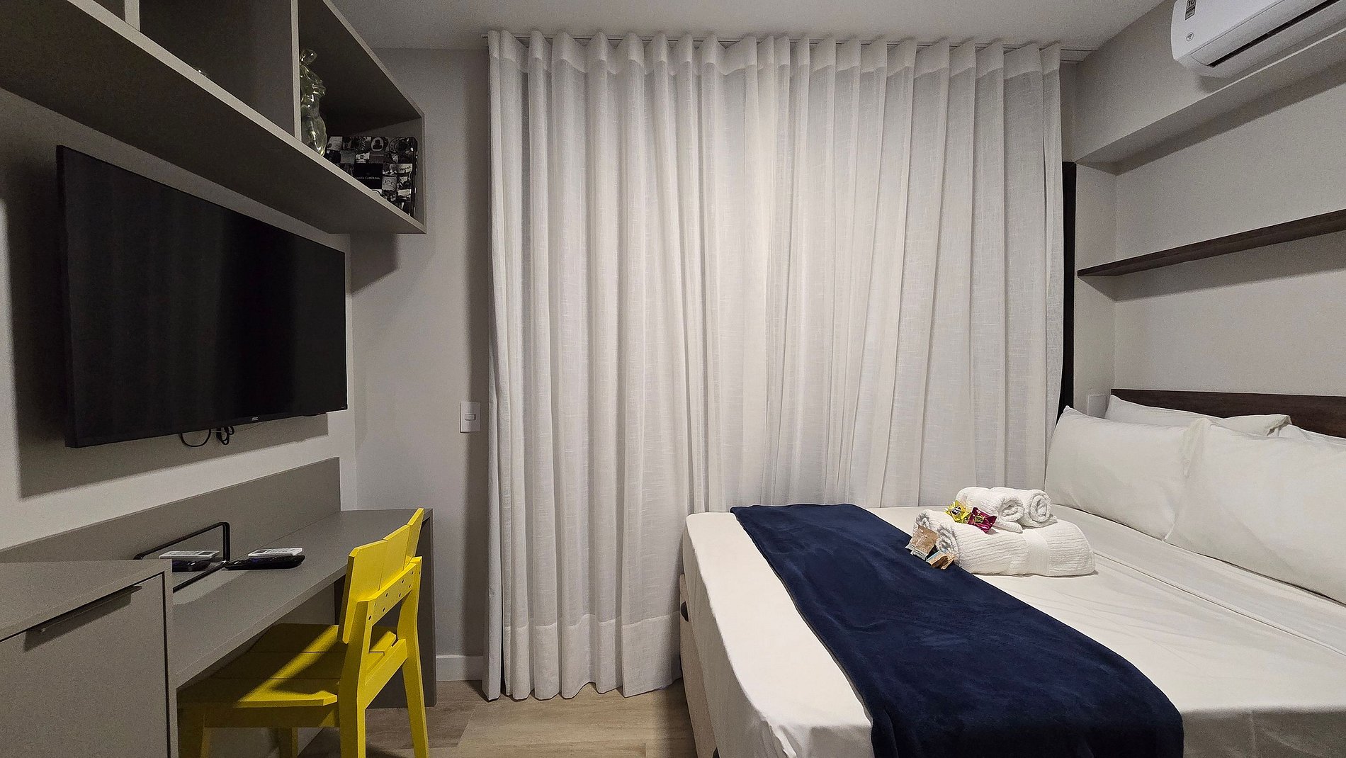 • Cama de casal com colhão confortável com cortina blackout e quatro travesseiros.