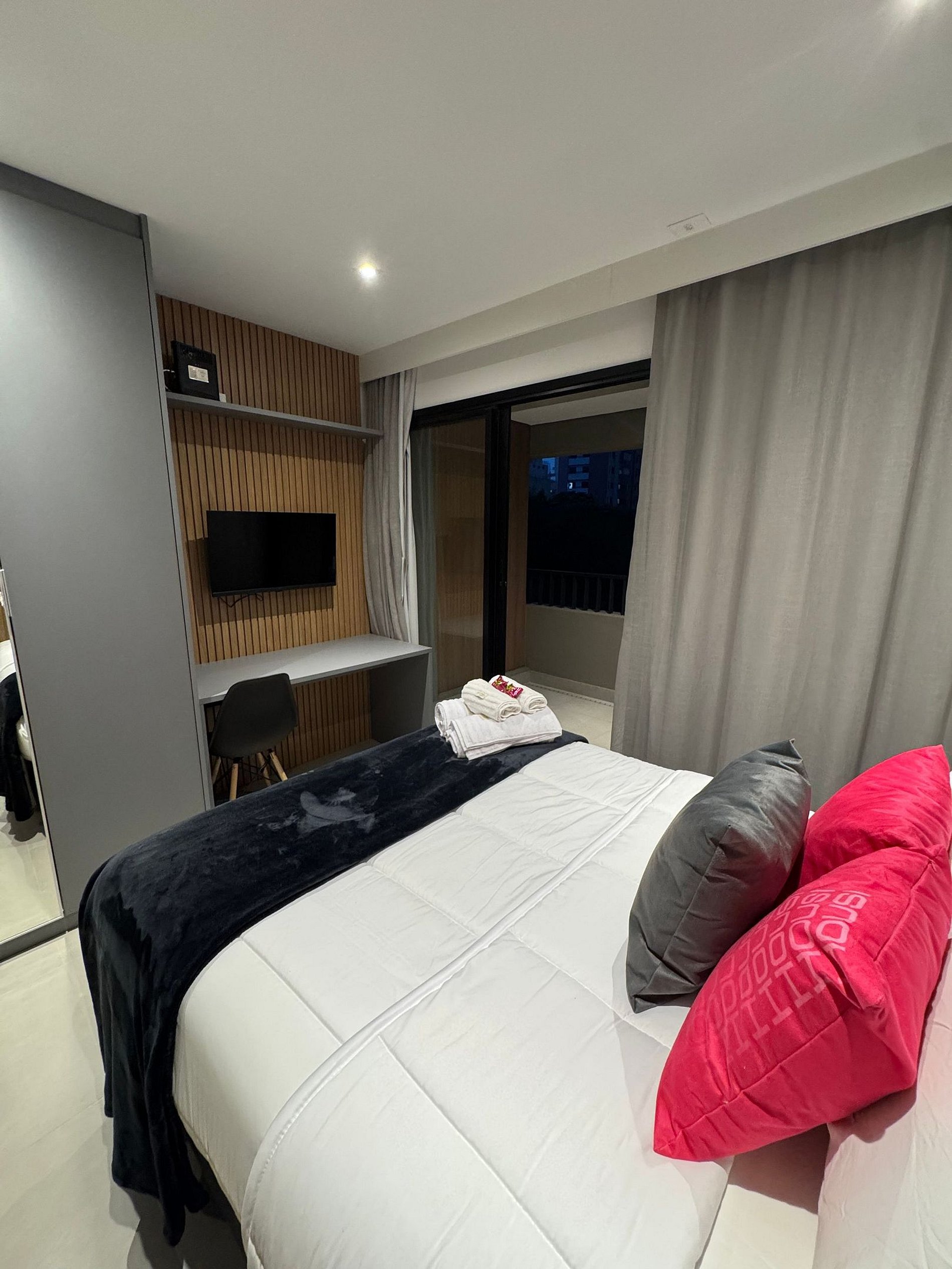 • Cama Casal confortável com enxoval linha 100 % algodão e quatro travesseiros.