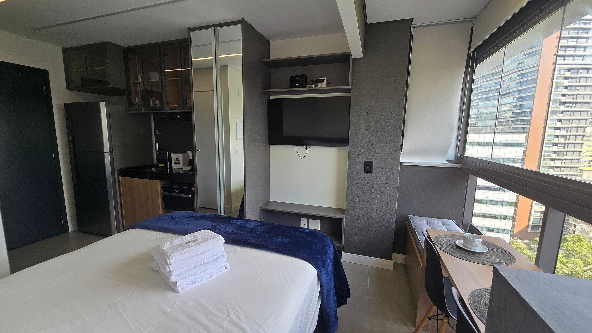 Studio bem iluminado e confortável, em tons neutros alternando cor cinza e madeira. Possui uma grande janela que mantém o ambiente claro e arejado além da vista privilegiada da metrópole.