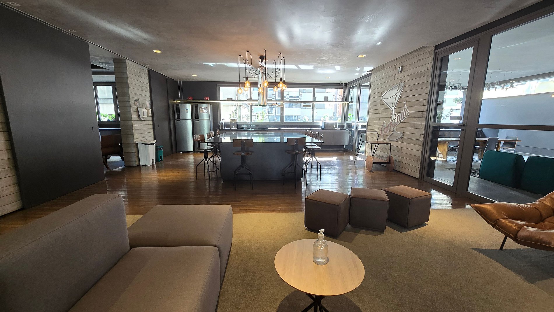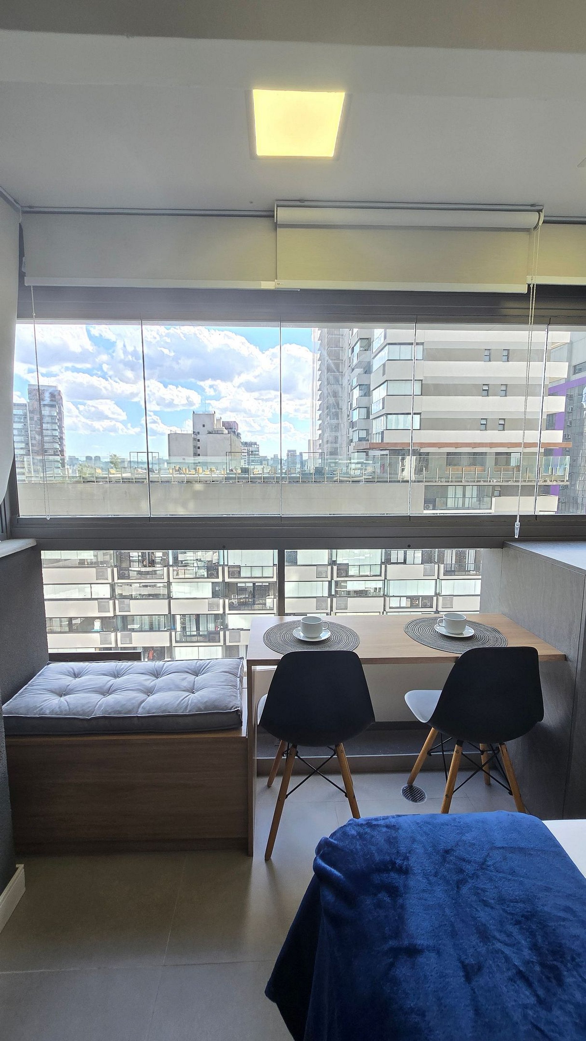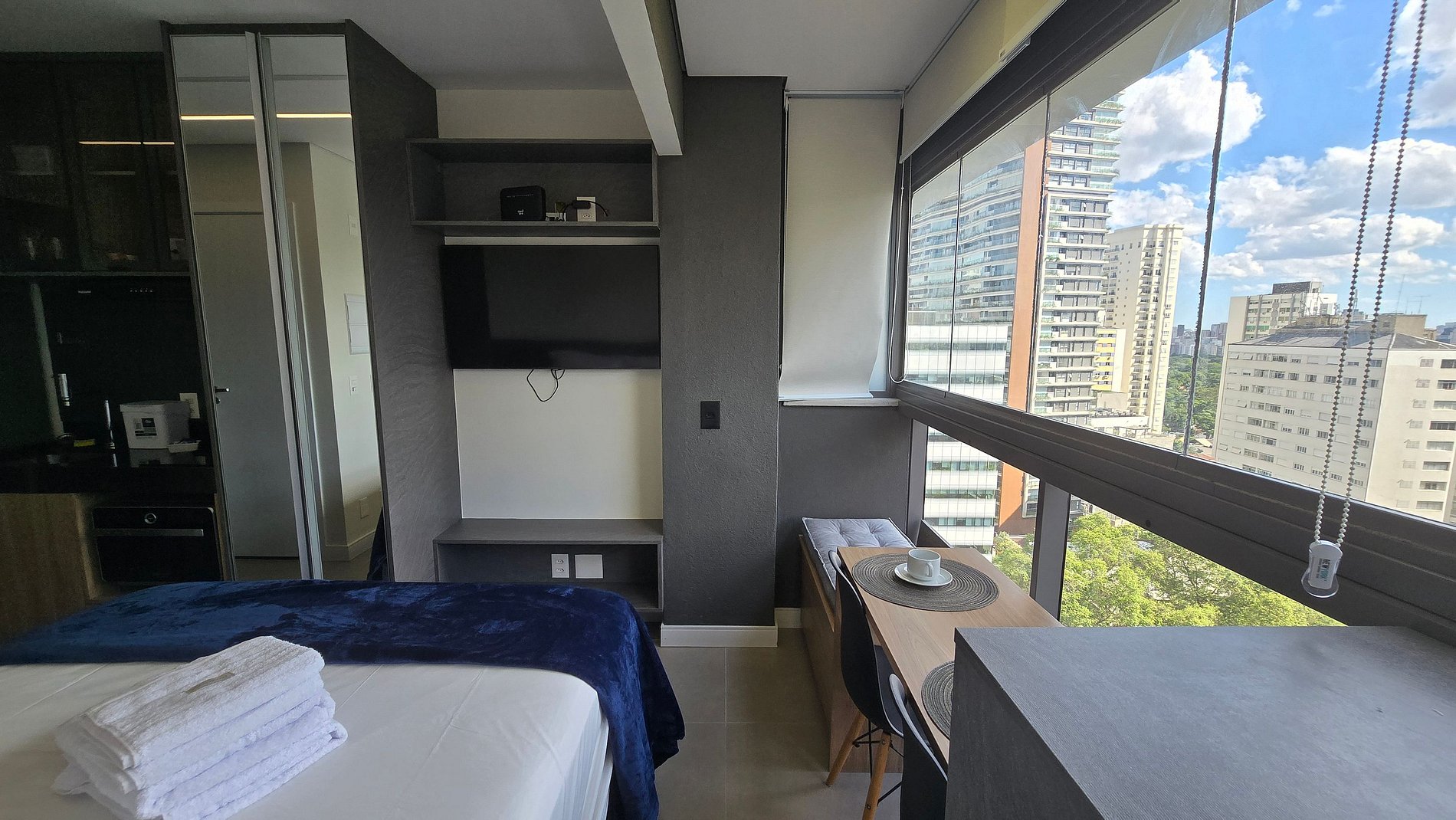 Studio bem iluminado e confortável, em tons neutros alternando cor cinza e madeira. Possui uma grande janela que mantém o ambiente claro e arejado além da vista privilegiada da metrópole.