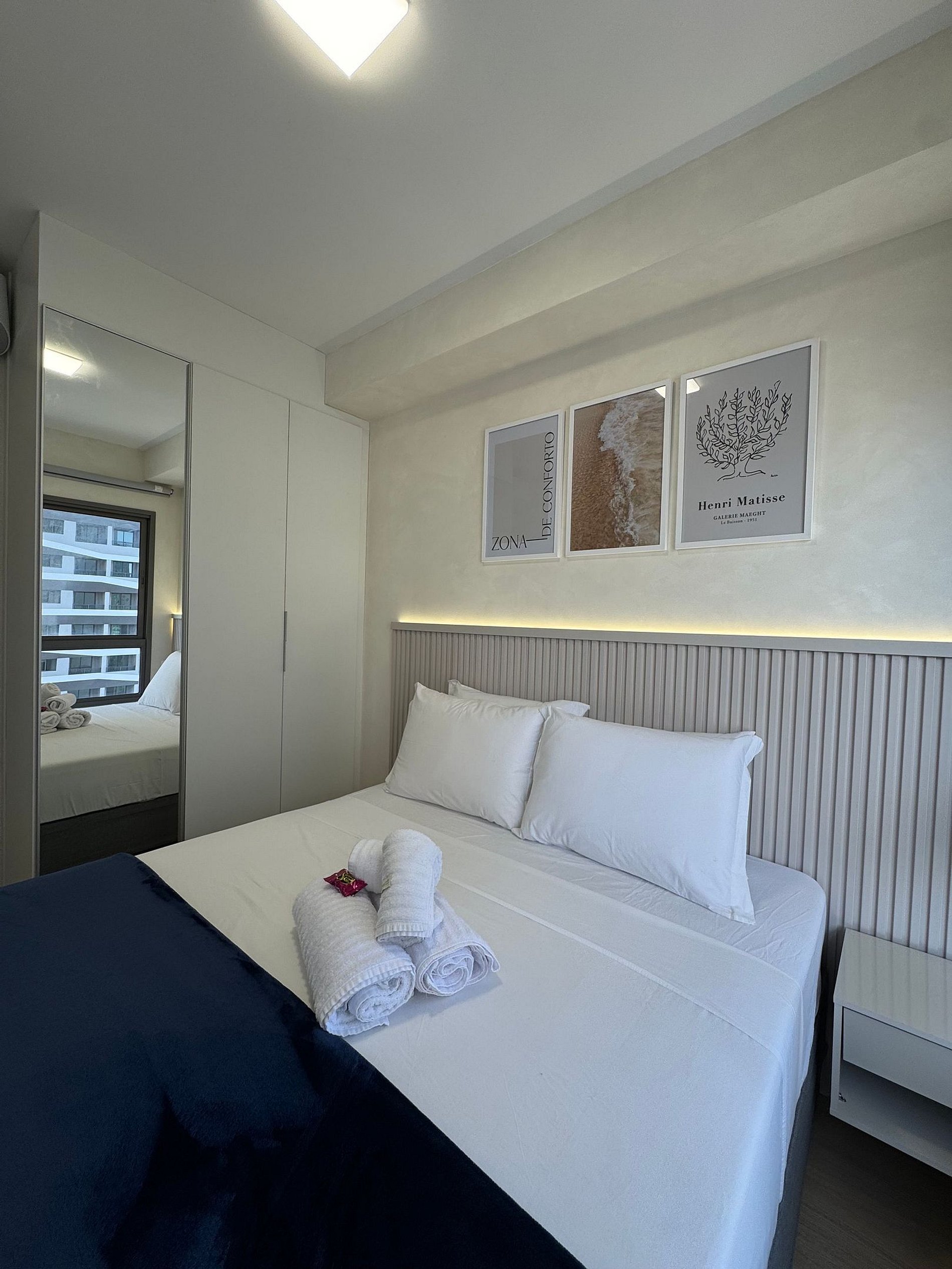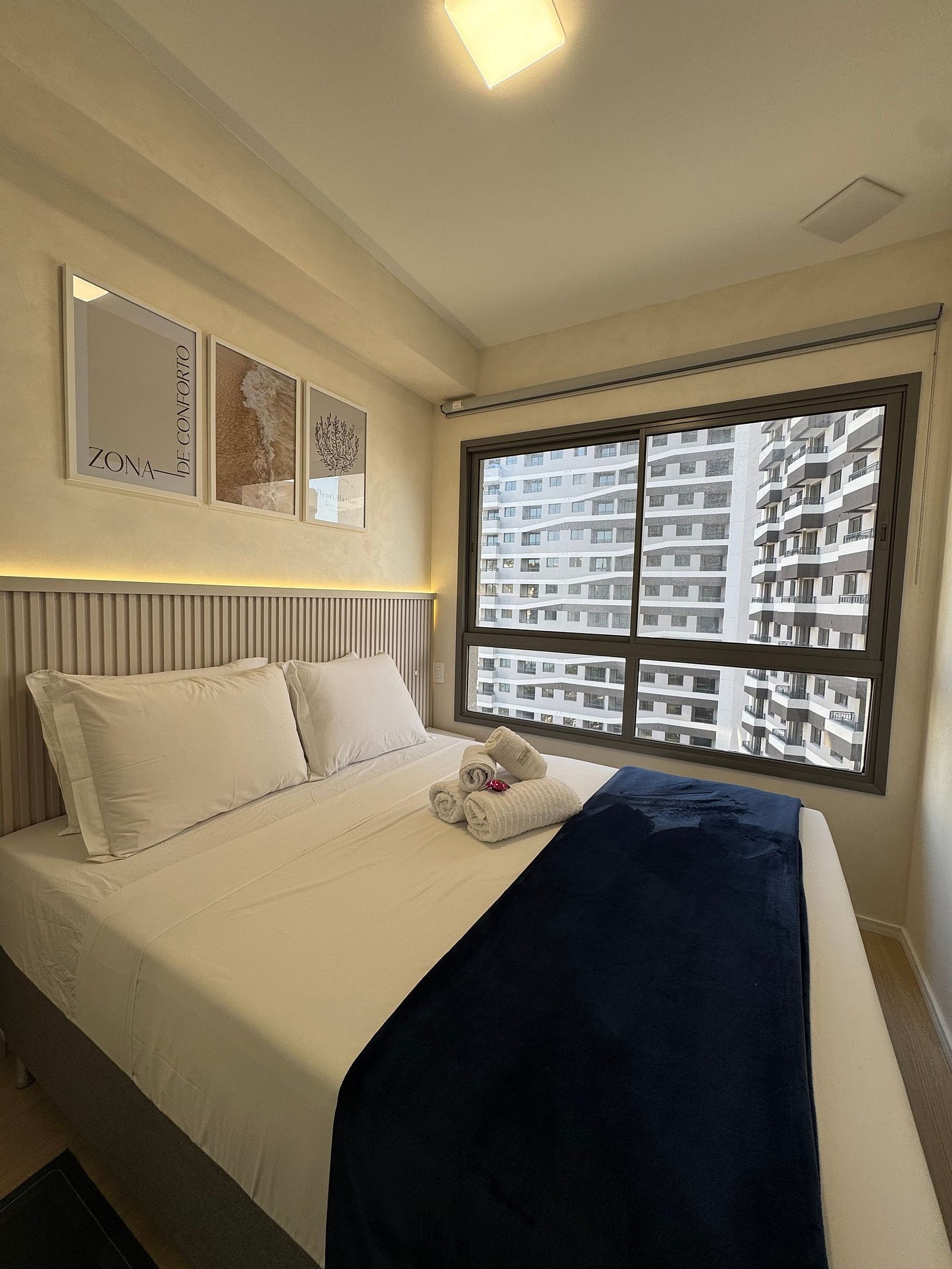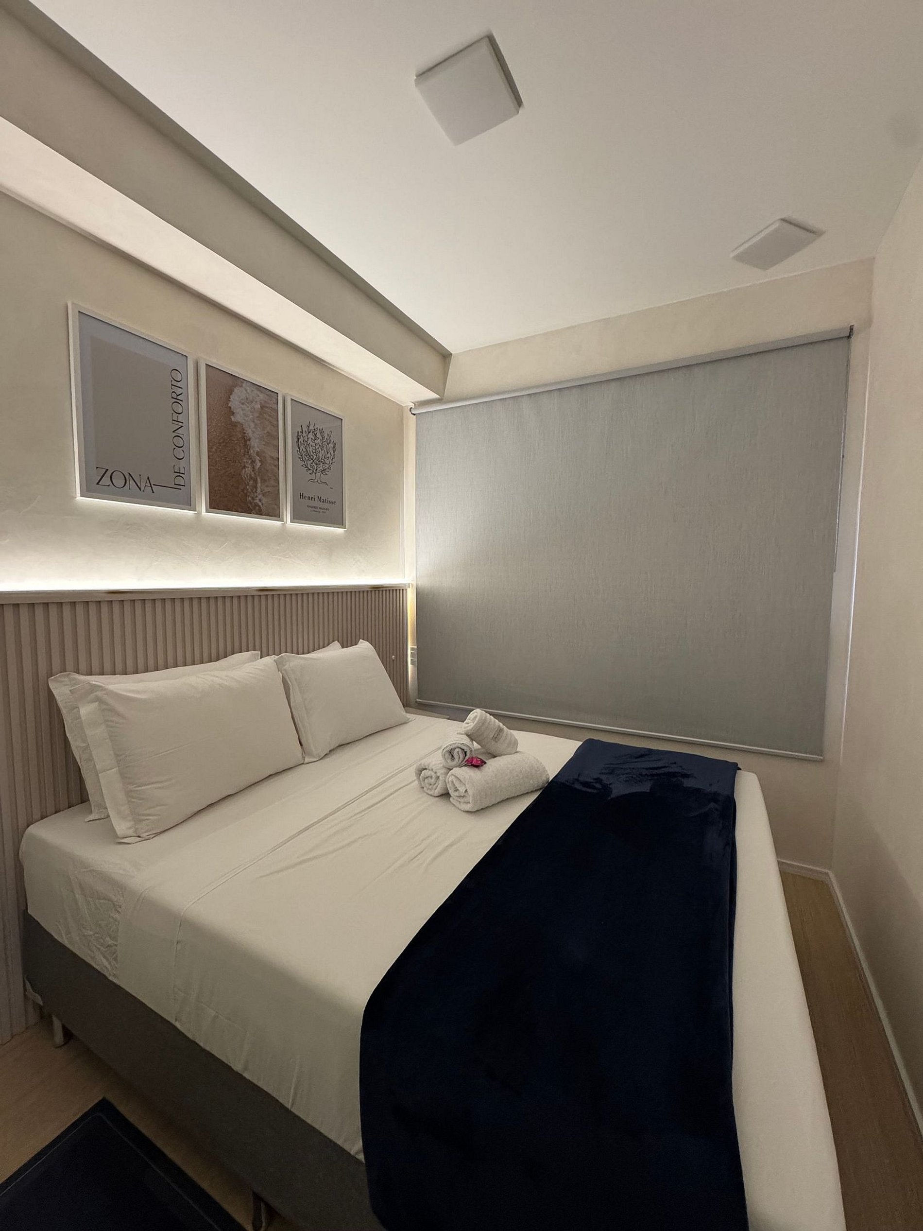 • Cama Casal confortável com enxoval linha 100 % algodão e quatro travesseiros.