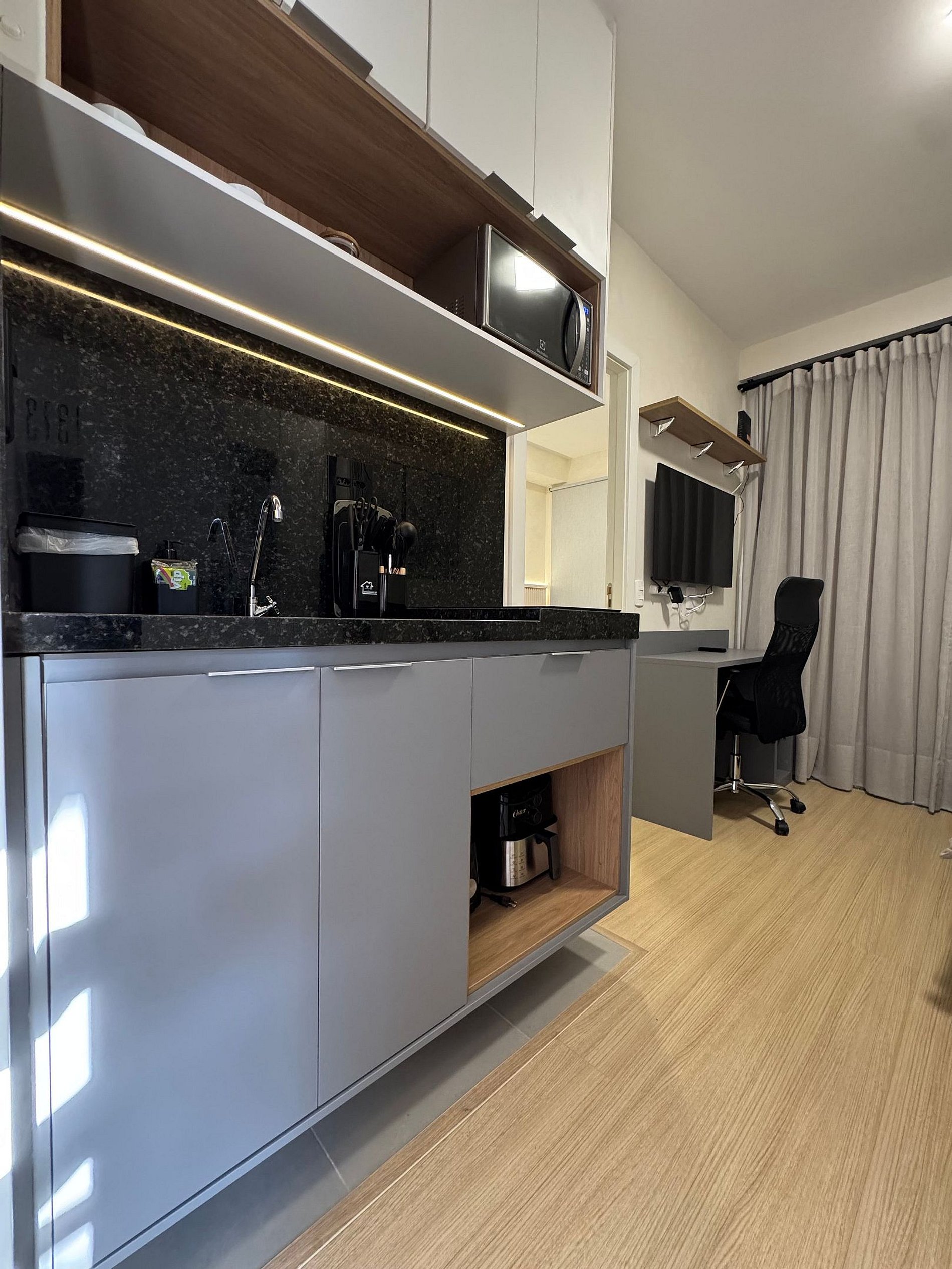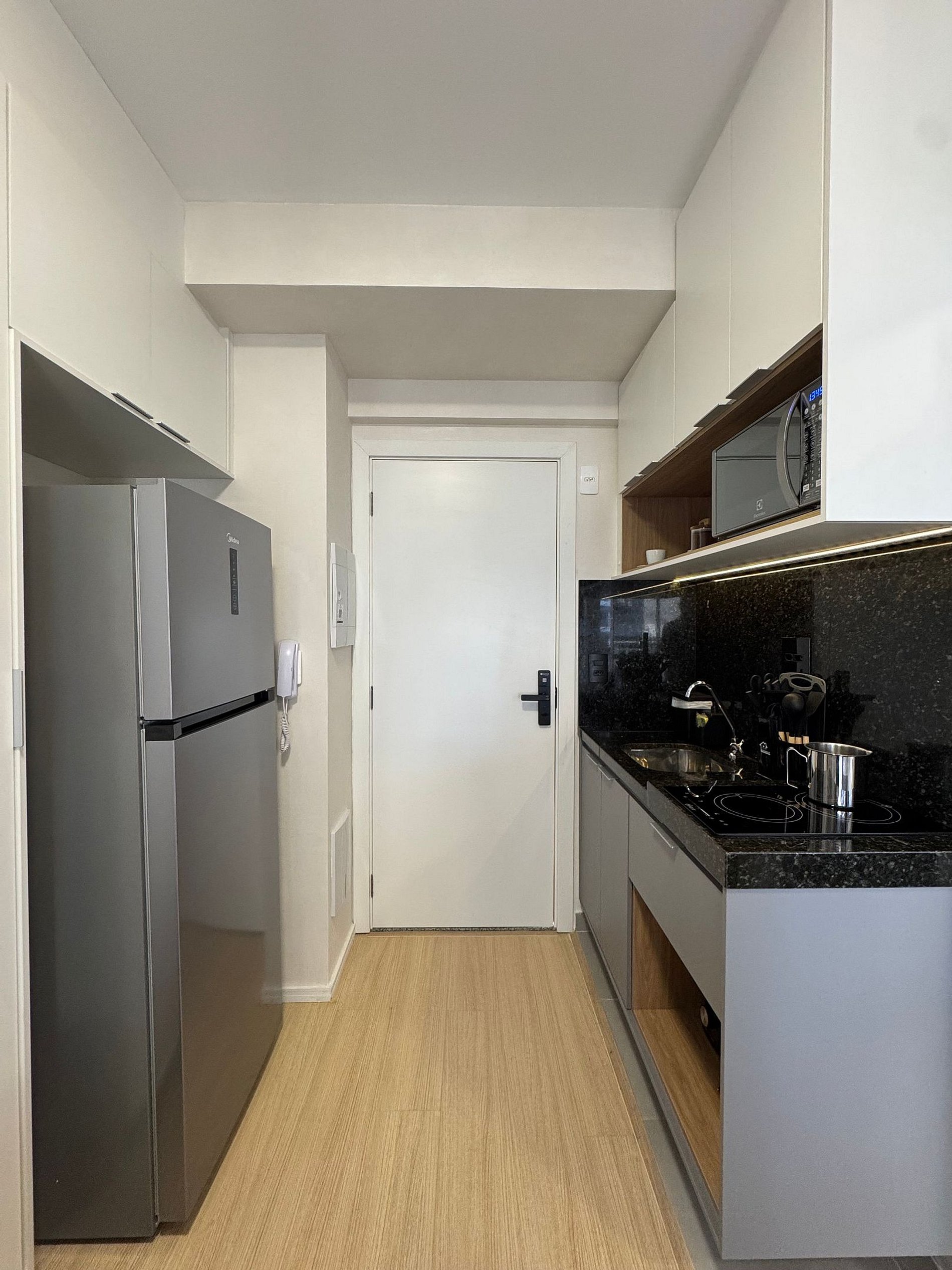 • Cozinha completa equipada com Geladeira grande adequada para longas estadias , fogão cooktop de duas bocas, micro-ondas, air frier, panelas e utensílios de qualidade.