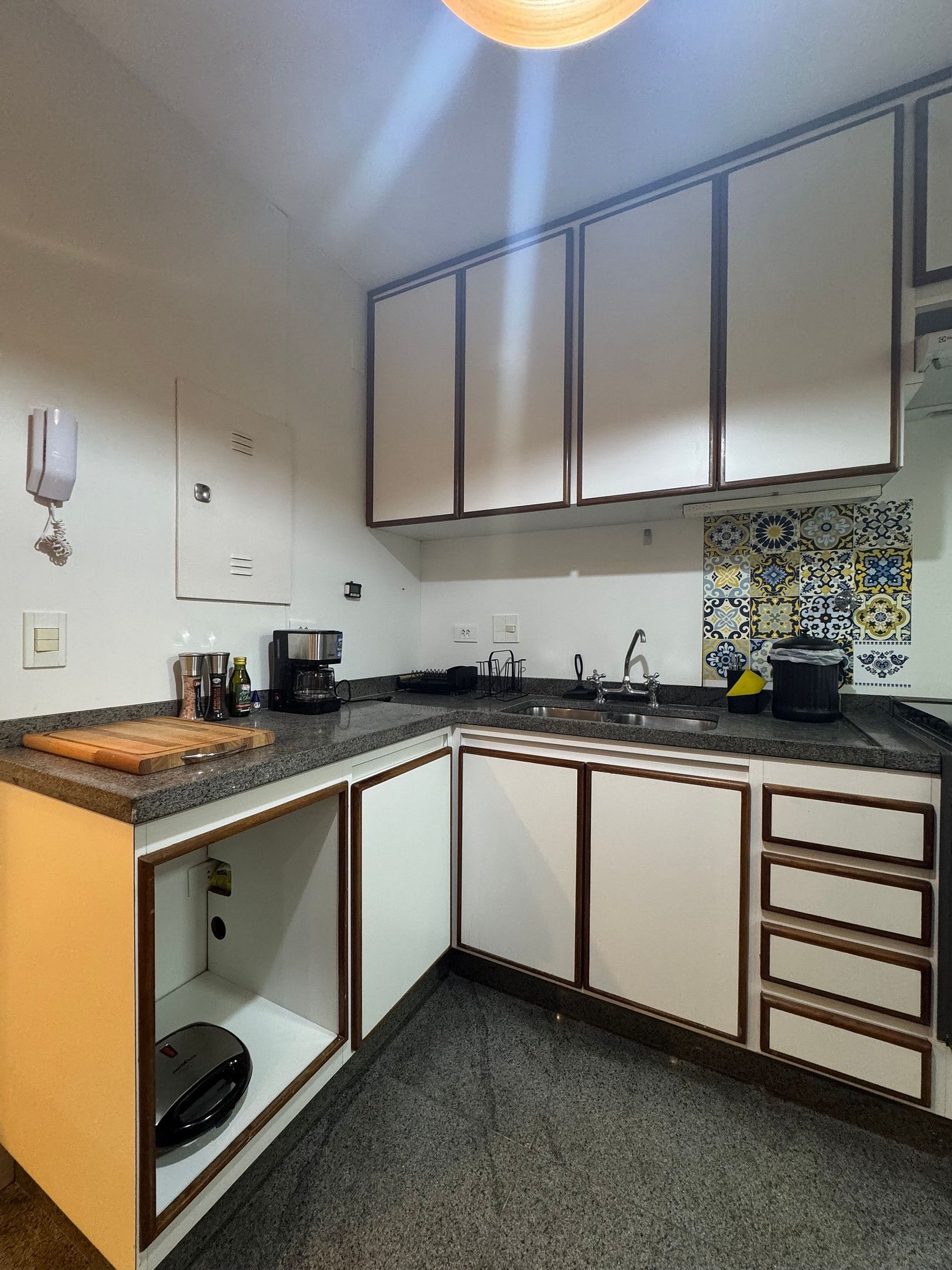 • Cozinha americana completa em utensílios equipada com geladeira grande adequada para longas estadias , fogão 4 bocas com forno, micro-ondas, liquidificador, Cafeteira, sanduicheira, panelas e utensílios de qualidade.