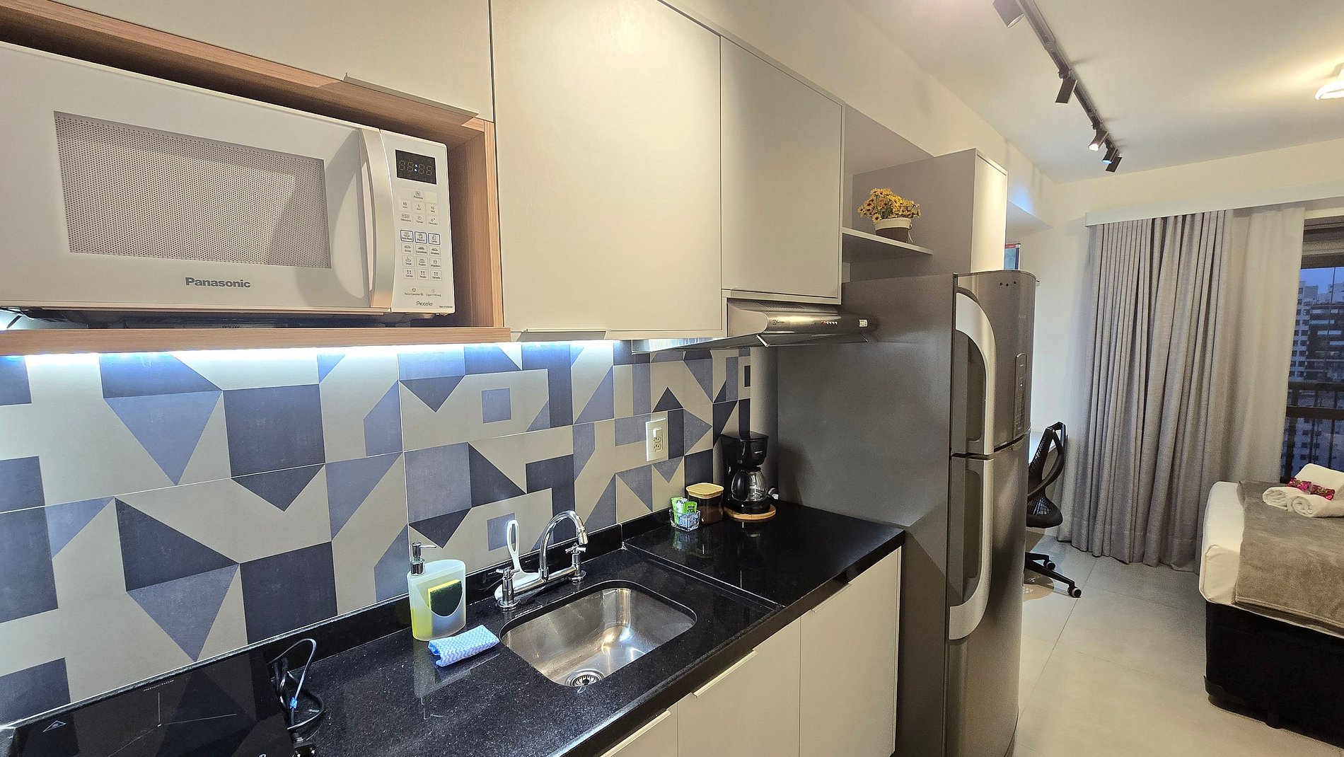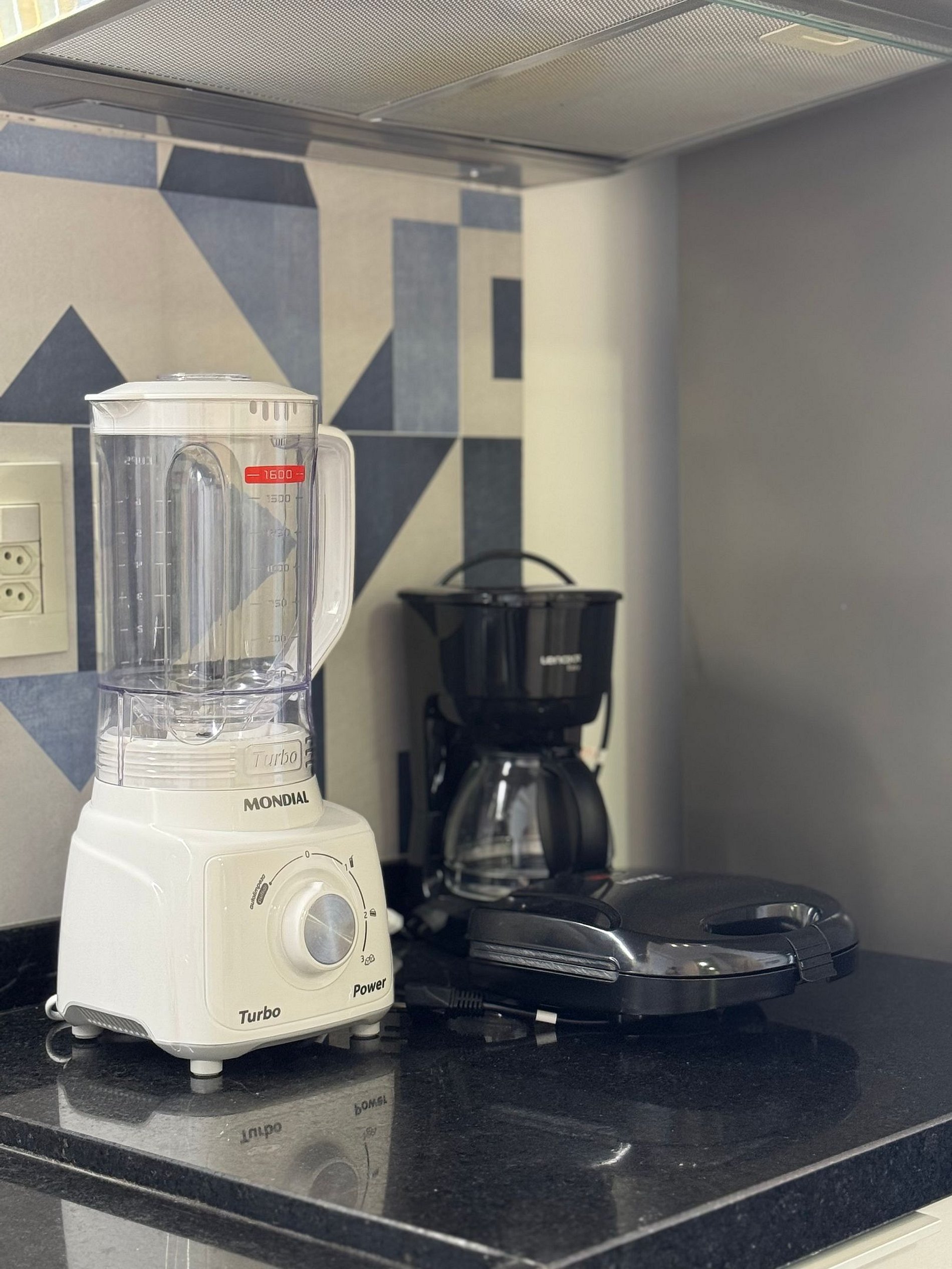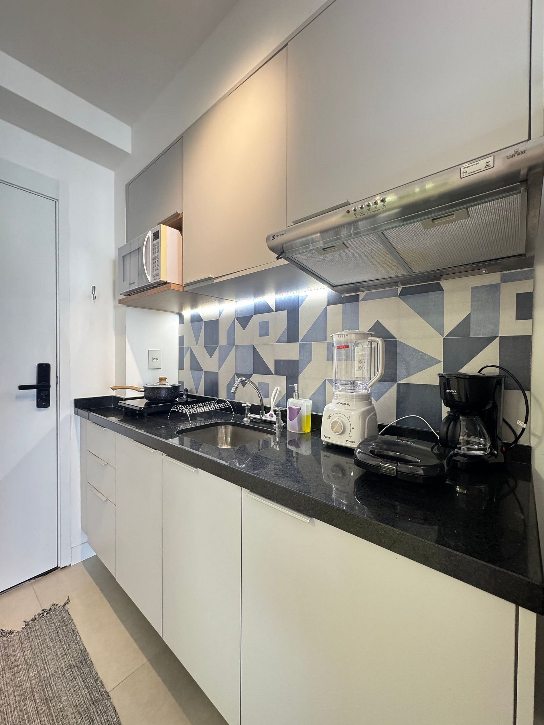 • Cozinha completa, rica em armários. Equipada com Geladeira Eletrolux Grande , fogão cocktop boca única, máquina de café elétrica, micro-ondas, liquidificador, sanduicheira, panelas e utensílios de qualidade.