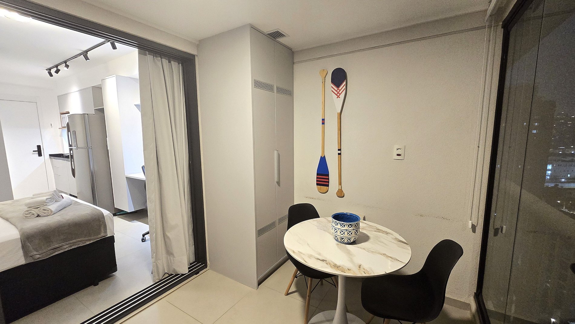 O apartamento está localizado na Vila Mariana a pouco minutos do parque Ibirapuera. O apartamento é aconchegante e moderno e conta com uma cama de casal e uma varanda com mesa e cadeira, e um sofá. É bem iluminado, e com decorações suaves.