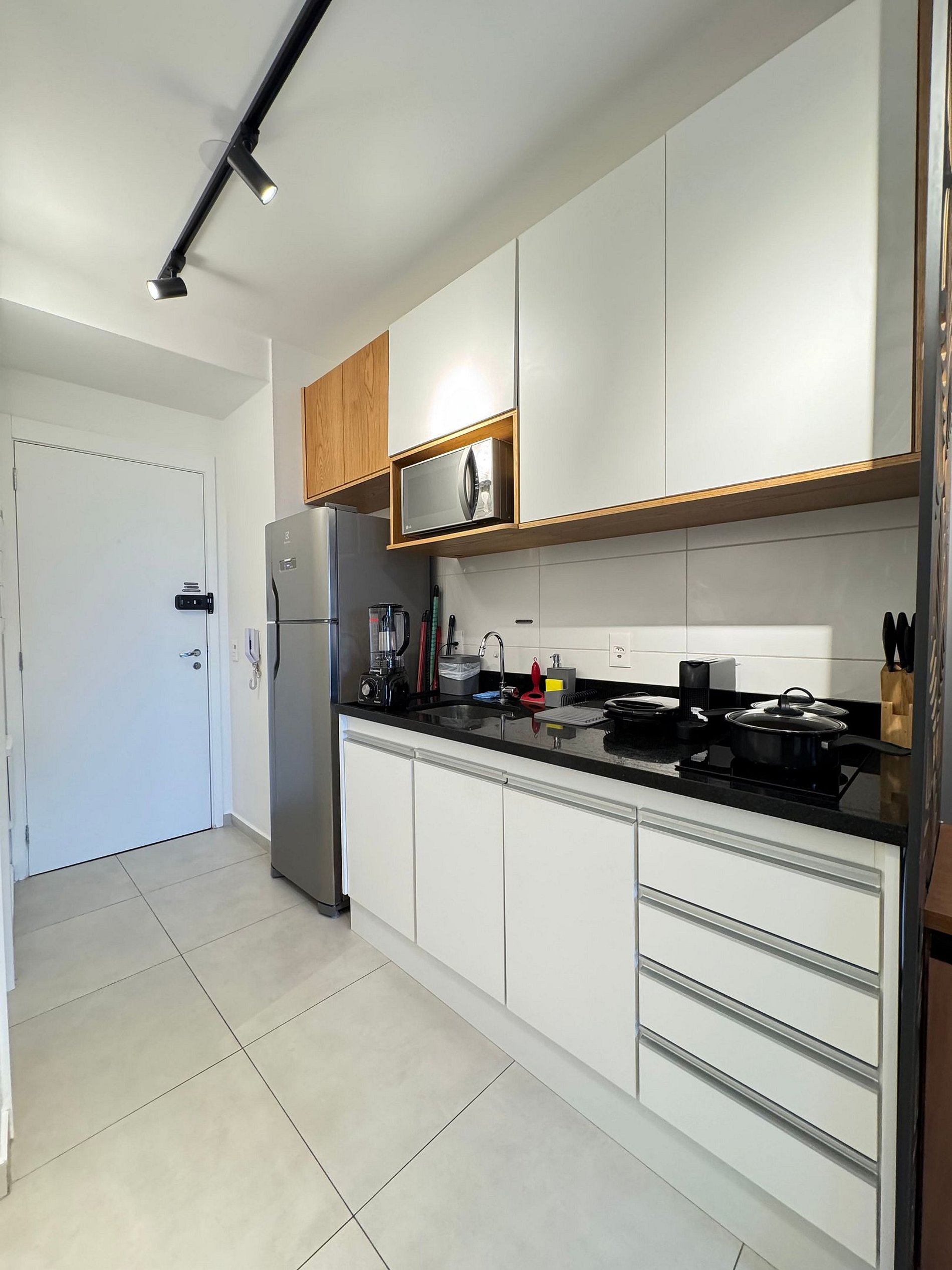 • Cozinha compacta porem completa equipada com fogão coocktop de duas bocas, cafeteira, liquidificador, micro-ondas, panelas e utensílios de qualidade.